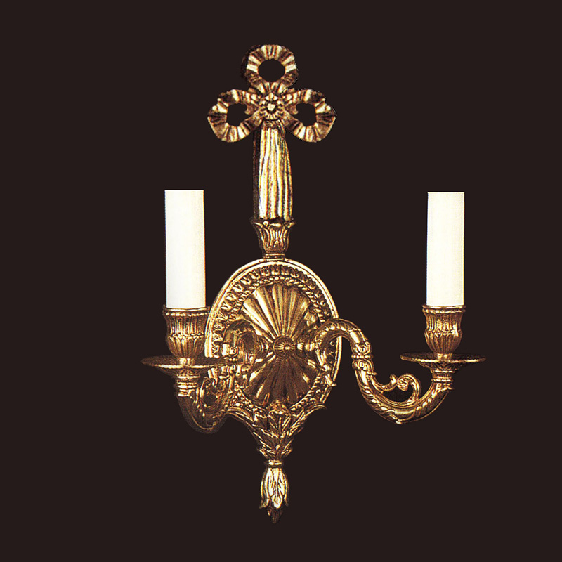Бра 2-рожковое на металлической арматуре цвета французского золота под старину (патиной). Дизайн ламп выполнен в виде свечей в подсвечниках. Светильник станет прекрасным украшением холла, гостиной и других помещений, где необходимо создать изысканный дизайн.