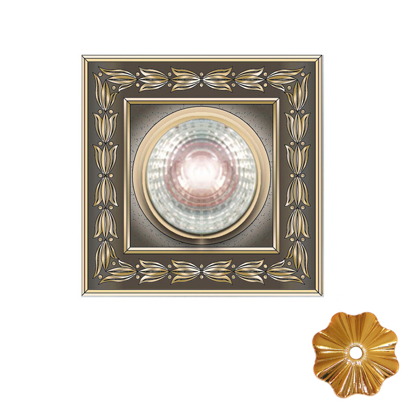 Встраиваемый светильник из металла. Золотое покрытие в 24 карата. Подойдет для освещения актовых и приемных залов, прихожих, гостиниц и других помещений, где необходимо создать изысканный дизайн.