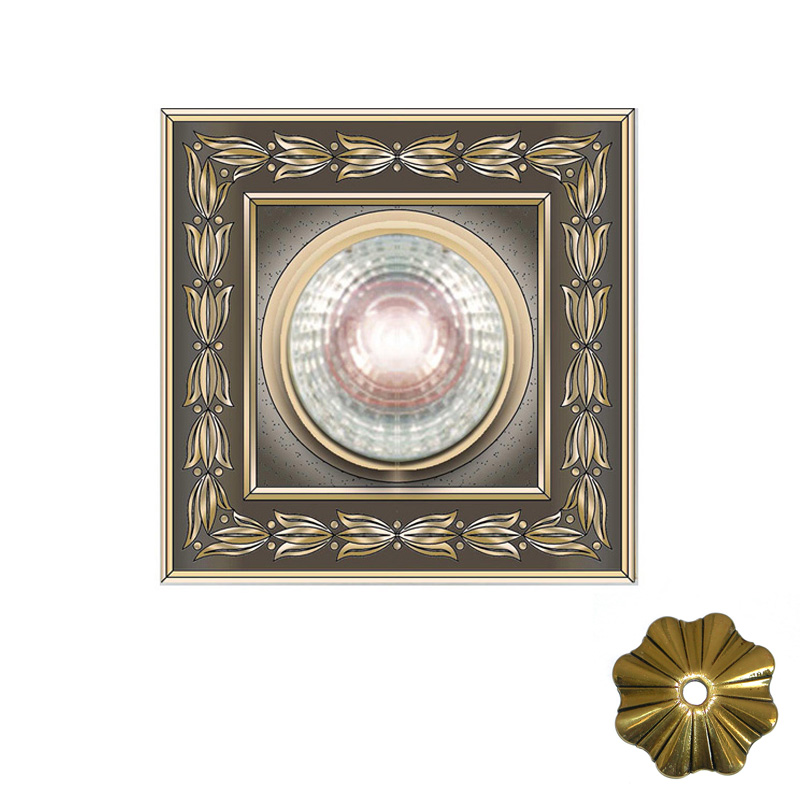 Встраиваемый светильник из металла. Цвет: французское золото с коричневыми потертостями под старину (патиной). Подойдет для освещения актовых и приемных залов, прихожих, гостиниц и других помещений, где необходимо создать изысканный дизайн.