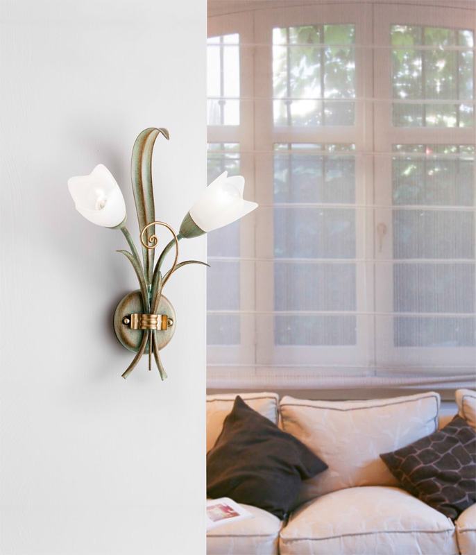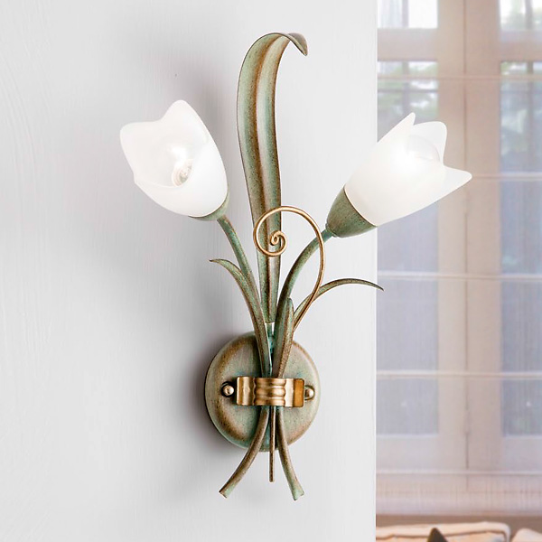 Бра 2-х рожковое из коллекции Fontana на металлической арматуре. Плафоны выполнены из стекла белого цвета в виде бутонов цветов. Цвет арматуры: светло-зеленый с золотой патиной. Под заказ возможны различные варианты отделки.