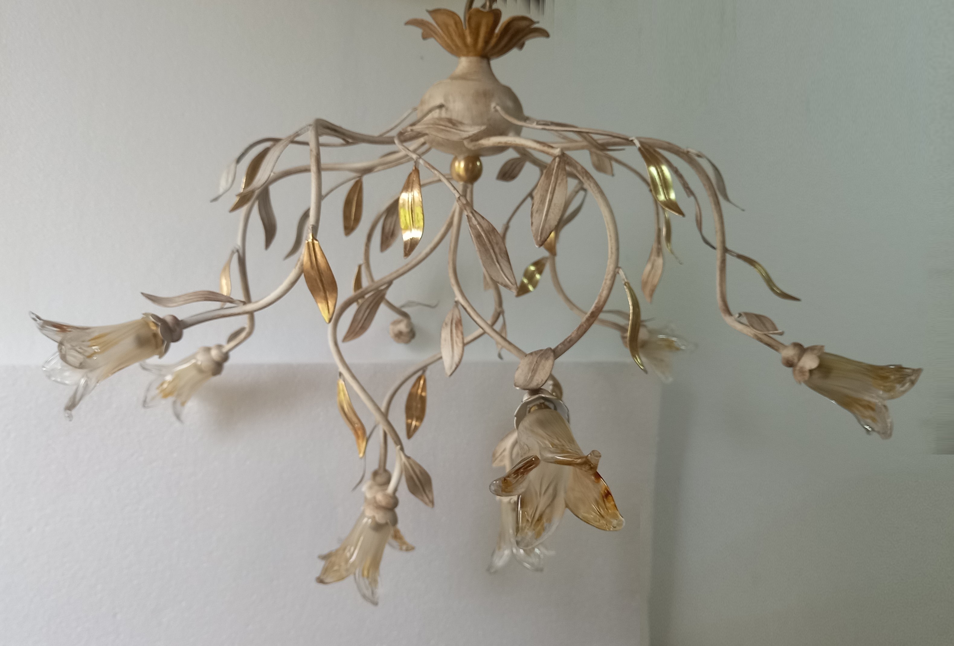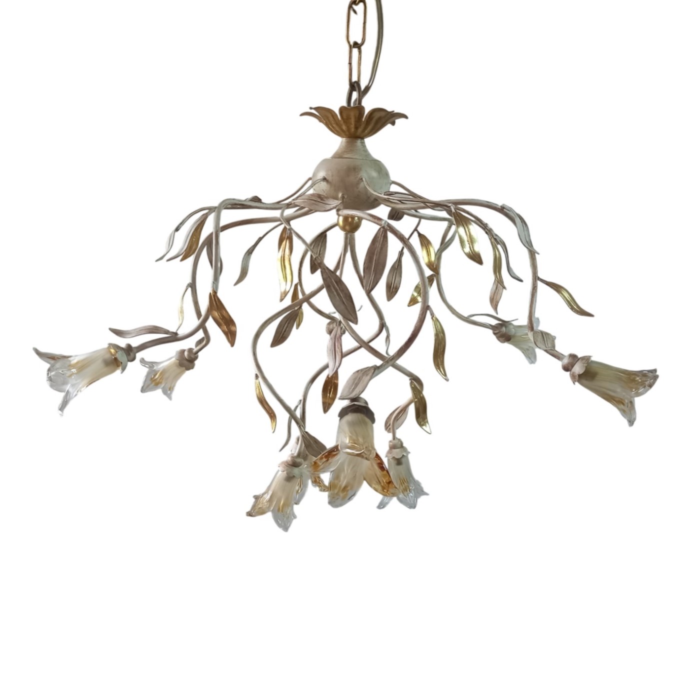 Люстра 9-ти рожковая на металлической арматуре. Плафоны выполнены из прозрачного с янтарным стекла в виде бутонов цветов. Цвет арматуры: золотой с белой патиной. Высота светильника регулируется за счет звеньев цепи.