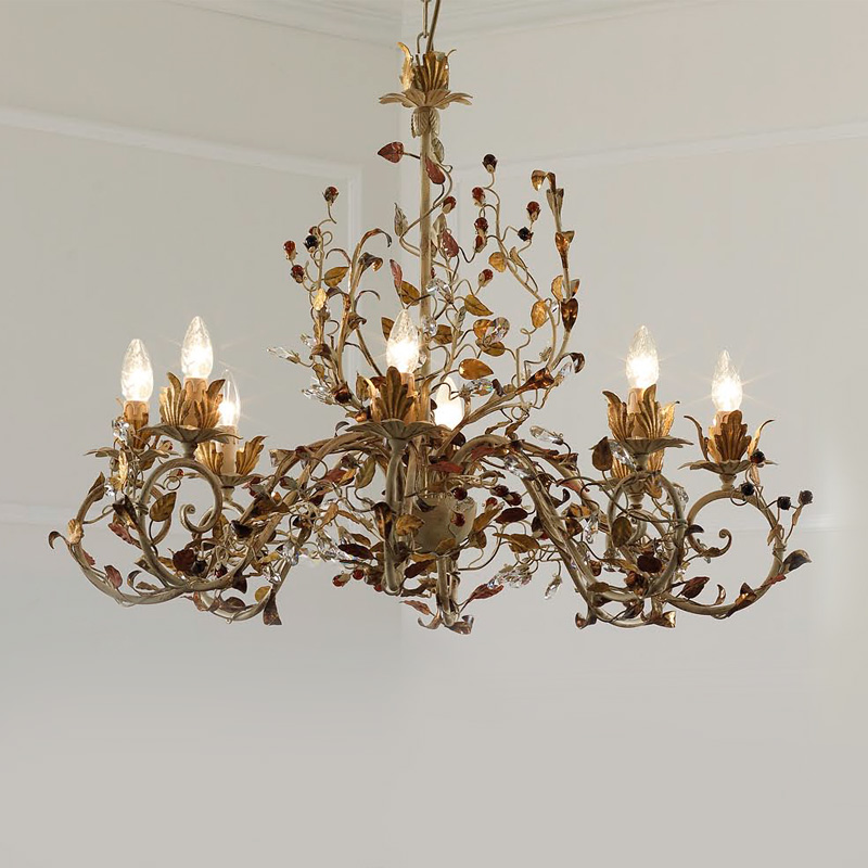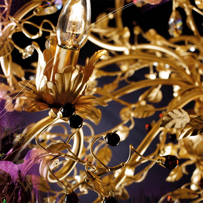 Люстра 8-ми рожковая из коллекции Mughetto на металлической арматуре. Цвет арматуры: бежевый. Декор: сочетание прозрачных хрусталиков и янтарных капель из муранского стекла. Высота светильника регулируется за счет звеньев цепи. Под заказ возможны различные варианты отделки.