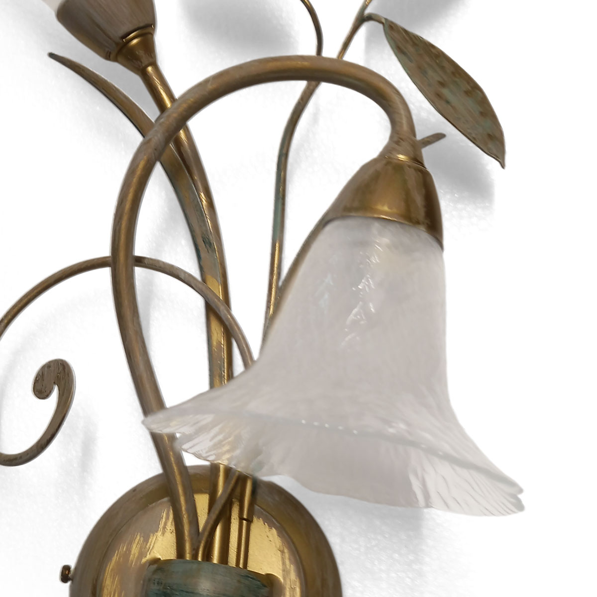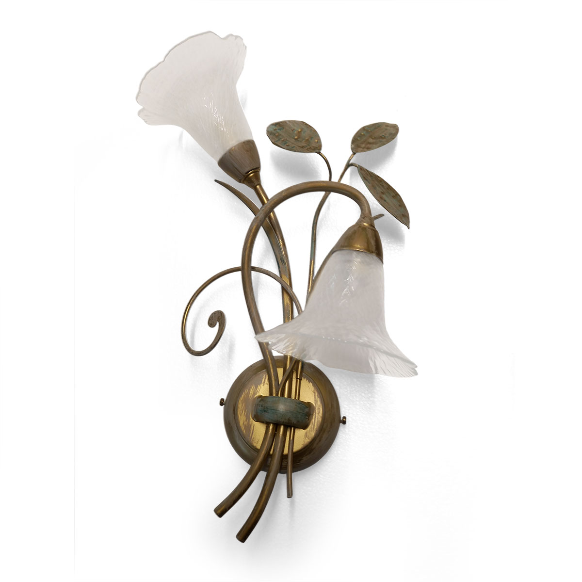 Бра 2-х рожковое 1689/A2 на металлической арматуре. Плафоны выполнены из прозрачного стекла в виде бутонов цветов. Цвет арматуры: золотой с зеленой патиной.