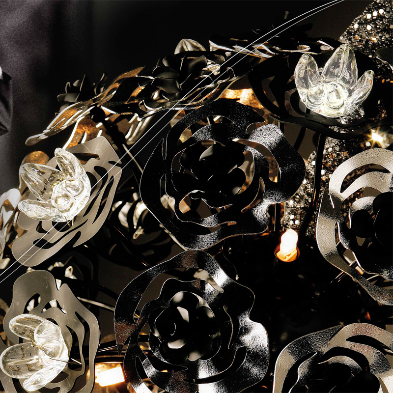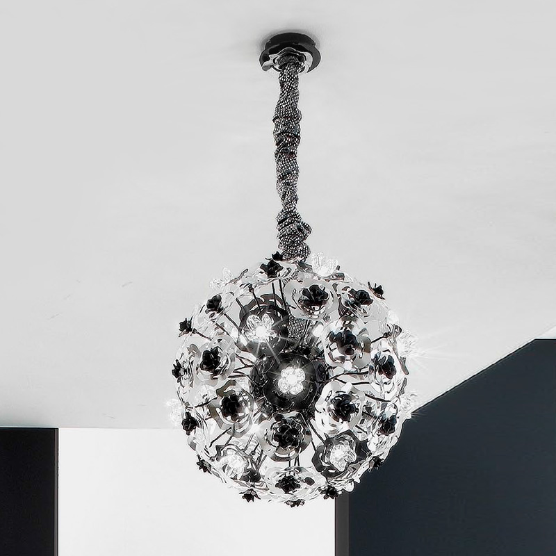 Подвесной светильник из коллекции Vie en Rose на металлической арматуре. Плафоны выполнены из стекла прозрачного цвета. Декор: металлические серебряные и черные цветочки. Цвет арматуры: серебряный. Под заказ возможны различные варианты отделки. Лампы: 8 x max 40W G9 + 16 x 1,2W LED