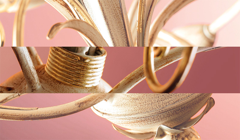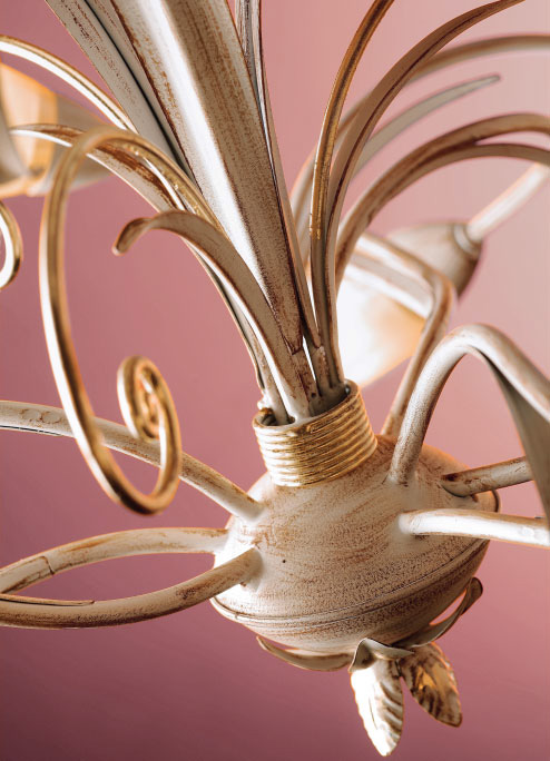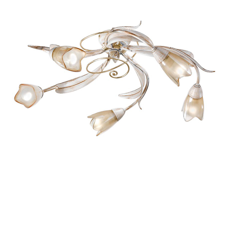 Потолочный светильник 5-ти рожковый из коллекции Fontana на металлической арматуре. Плафоны выполнены из стекла янтарного цвета в виде бутонов цветов. Цвет арматуры: светло-бежевый с золотой патиной. Под заказ возможны различные варианты отделки.