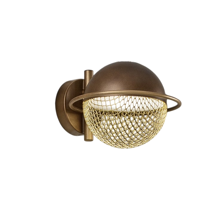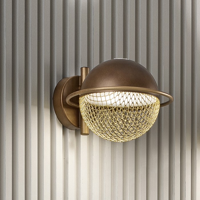 Настенный светильник Masiero Iglu А1 Bronzed из металла. Верхняя часть сферы окрашена в бронзовый цвет с матовой патиной, а нижняя часть в виде сетки, окрашенной в золотистый цвет.