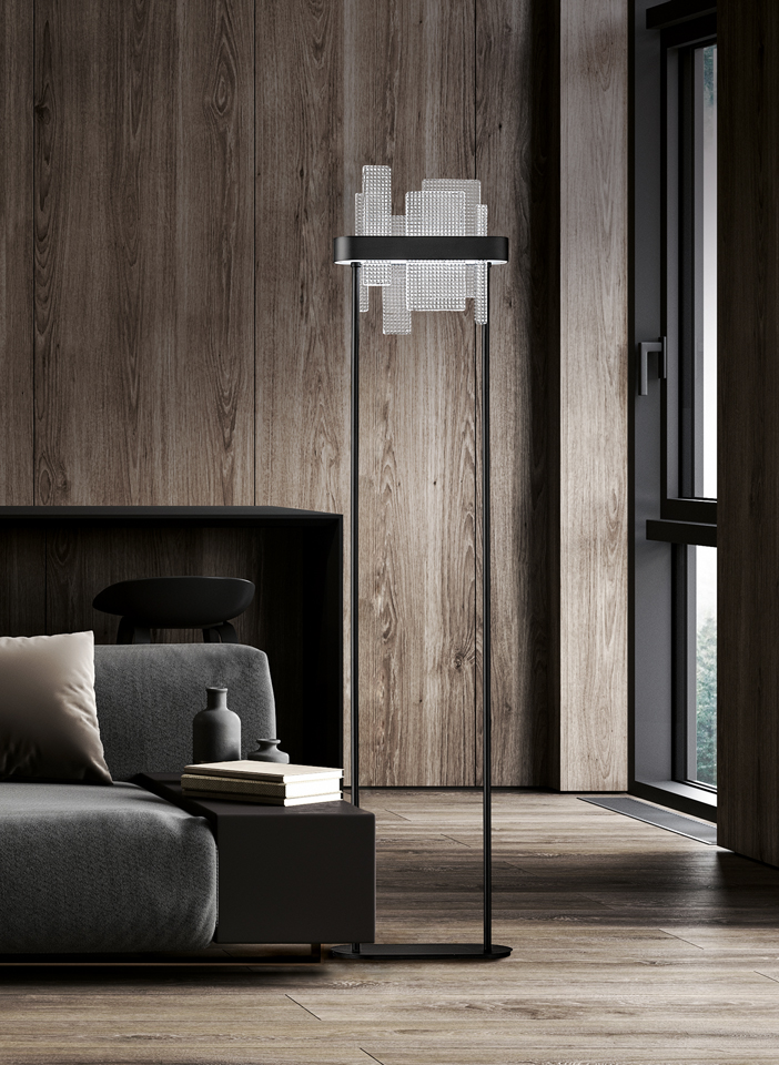 Торшер из коллекции Ribbon изготовлен из металла с отделкой черного матового цвета и рельефного венецианского стекла. Два LED источника освещения, верх 6W, низ 6W.