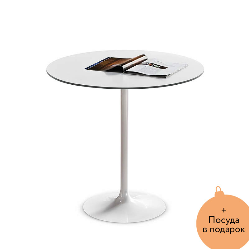 Небольшой стол диаметром 80 см с основанием из металла белого цвета. Столешница из керамики белого цвета (White oxide (K21)).