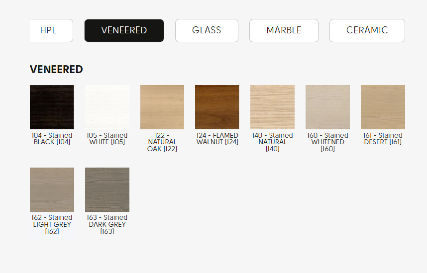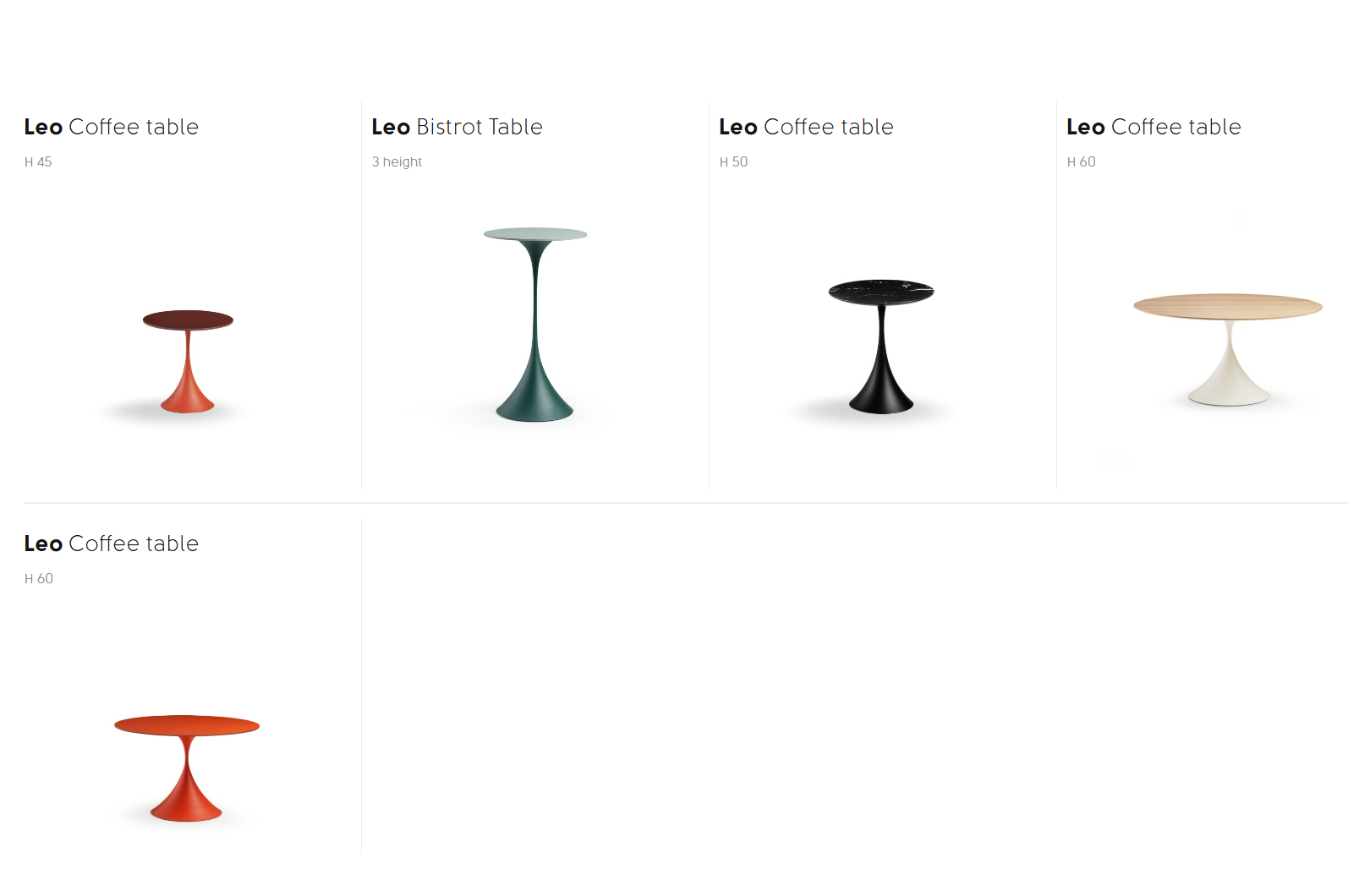 В коллекции Leo представлены кофейные, обеденные, бистро-столики с различными диаметрами и отделками столешниц, включая натуральный шпон, керамику, стекло, мрамор, бумажно-слоистый пластик. Благодаря разнообразной палитре отделок и цветовых вариаций можно создать собственный уникальный конструкторский проект Leo.