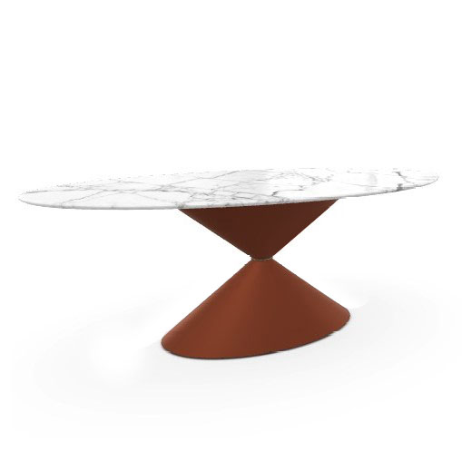 Овальный обеденный стол Midj Clessidra Elliptical. Стальная основа стола с отделкой бордового цвета (Bulgaro red (FP) cat.M2) и кольцом золотисто-бронзового цвета (Golden bronze (DB). Столешница из мрамора белого цвета (White Calacatta Vagli (MB4) cat.GMM).