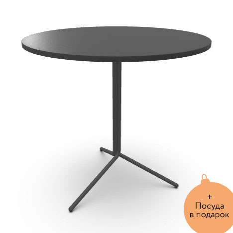 Небольшой стол с круглой столешницей диаметром 80 см из меламина графитового цвета. Основание из металла так же графитового цвета.