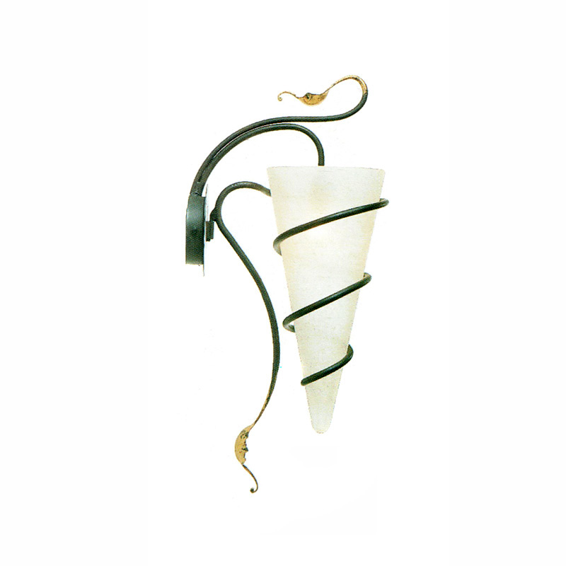 Бра однорожковое на кованной металлической арматуре. Плафон выполнен из матового белого стекла. Цвет арматуры: черный с золотыми элементами.