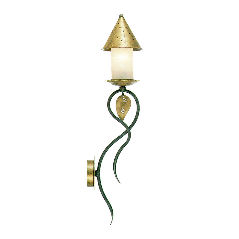 Бра однорожковое на кованной металлической арматуре. Плафон выполнен из матового белого стекла с металлическим куполом золотого цвета. Цвет арматуры: зеленый с золотыми элементами.