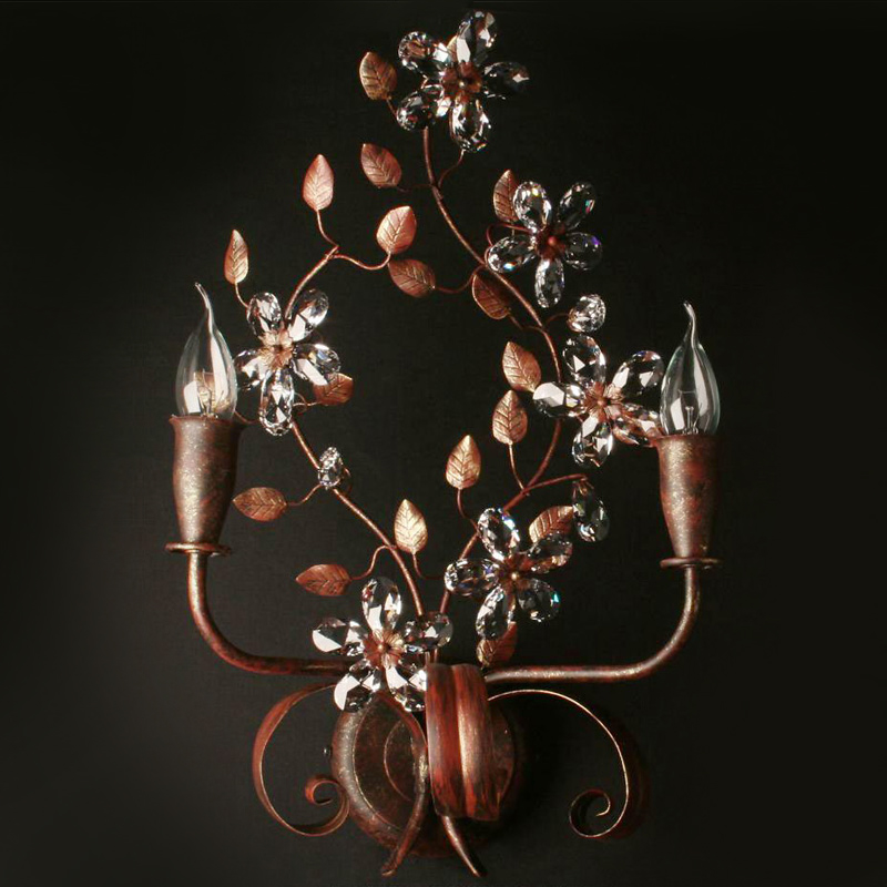 Бра 3-х рожковое из коллекции MALVA на арматуре из кованного металла с декоративными завитками и ветвями.Декор: кристаллы Swarovski в виде цветов. Цвет арматуры: черно-бордовый с золотыми потертостями. По индивидуальному заказу возможны различные модификации и варианты отделки. Примеры цветовой палитры представлены в разделе PDF каталогов.