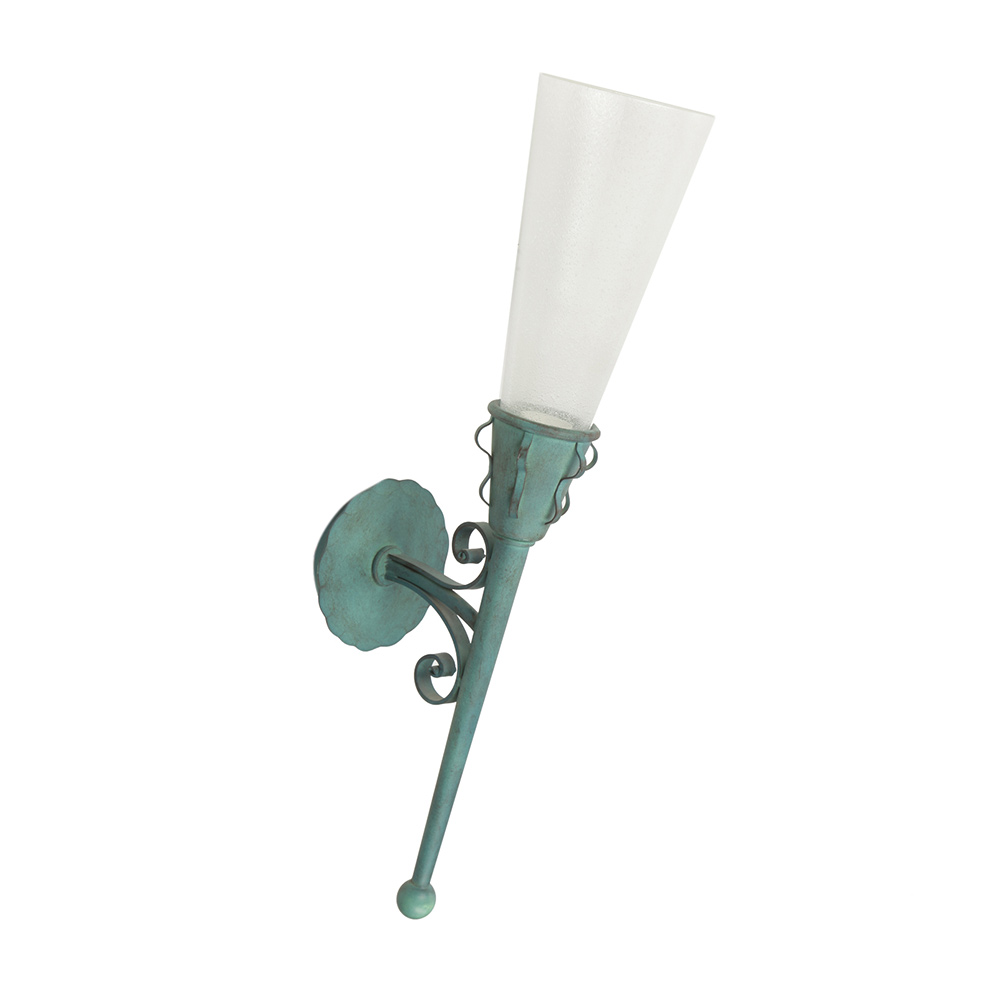 Настенный светильник одноррожковый выполнен из кованного металла. Плафон из стекла матового белого цвета. Цвет арматуры: морская волна с золотыми вкраплениями. Дизайн: Enrico de Girardi. По индивидуальному заказу возможны различные модификации и варианты отделки. Примеры цветовой палитры представлены в разделе PDF каталогов.
