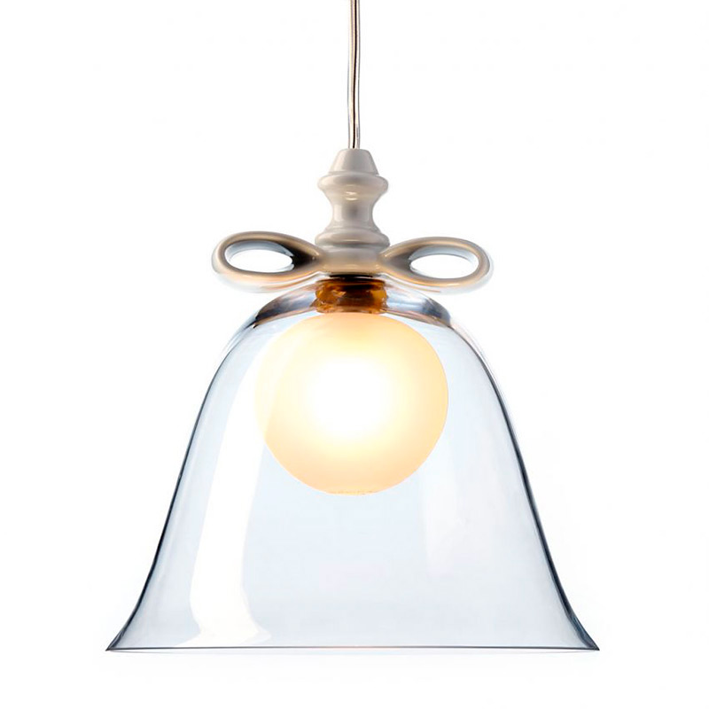 Подвесной светильник из коллекции BELL на металлической арматуре. Плафон выполнен из выдувного прозрачного стекла с керамическим бантом белого цвета у основания. Высота светильника регулируется до 400 см. Дизайн: Marcel Wanders, 2012. Арт. MOLBES-S-W1A Данная модель может быть заказана в различных цветовых вариациях.
