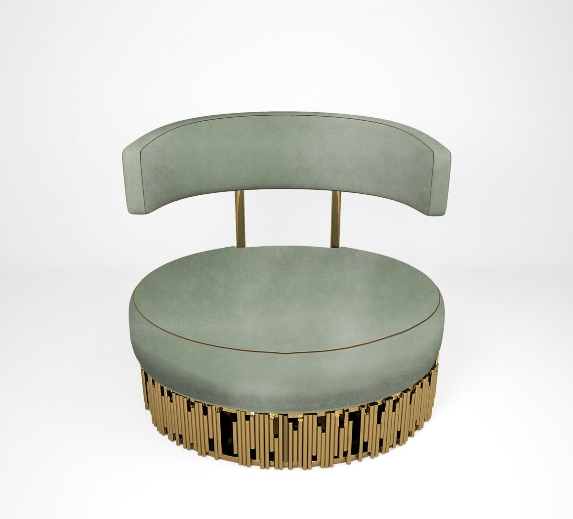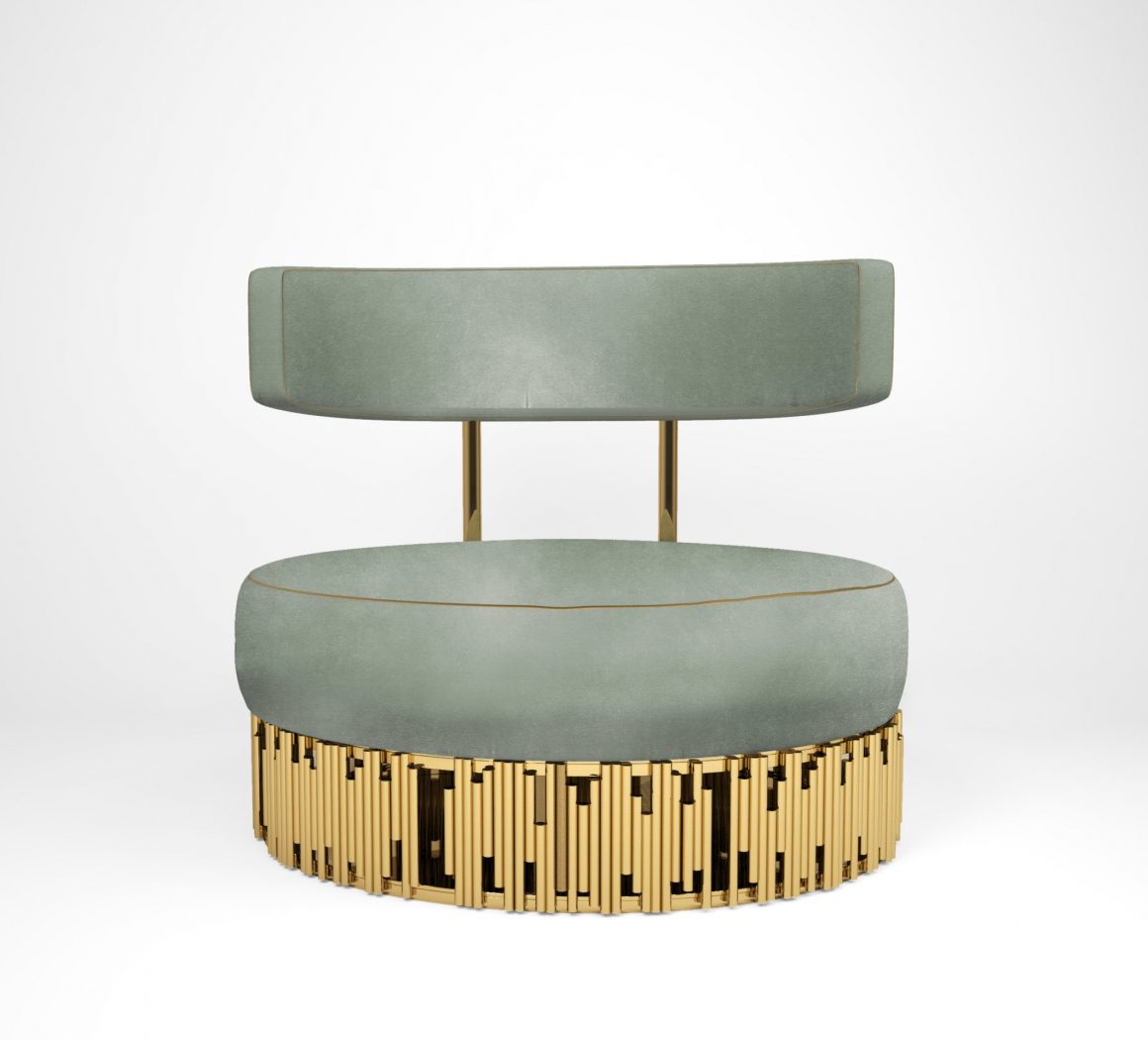 Обивка из аристократичного хлопкового бархата и симметричный каркас из полированной глянцевой латуни по-королевски обыгрывают облик привычного кресла, ненавязчиво создавая уникальный образец мягкой мебели.