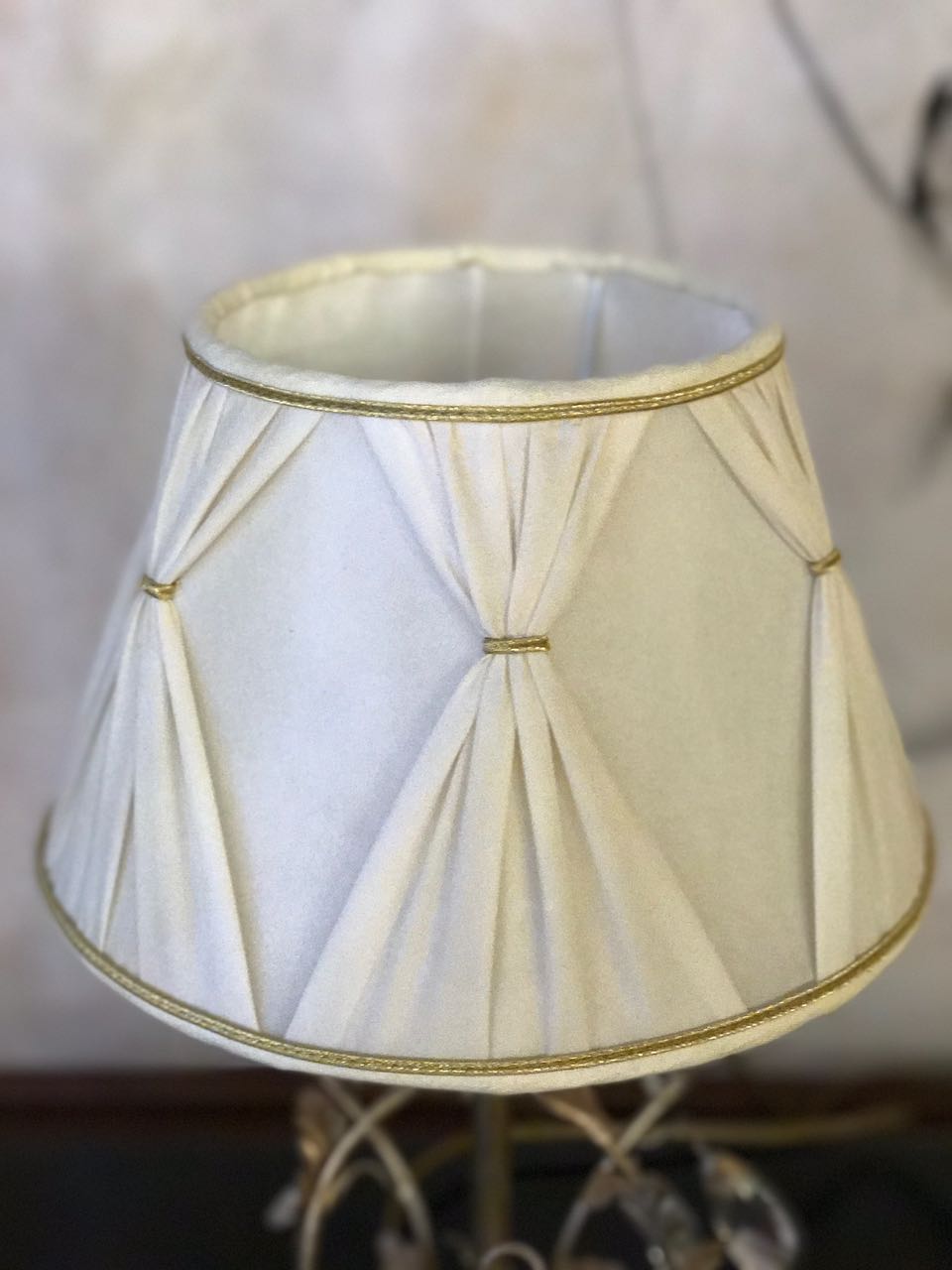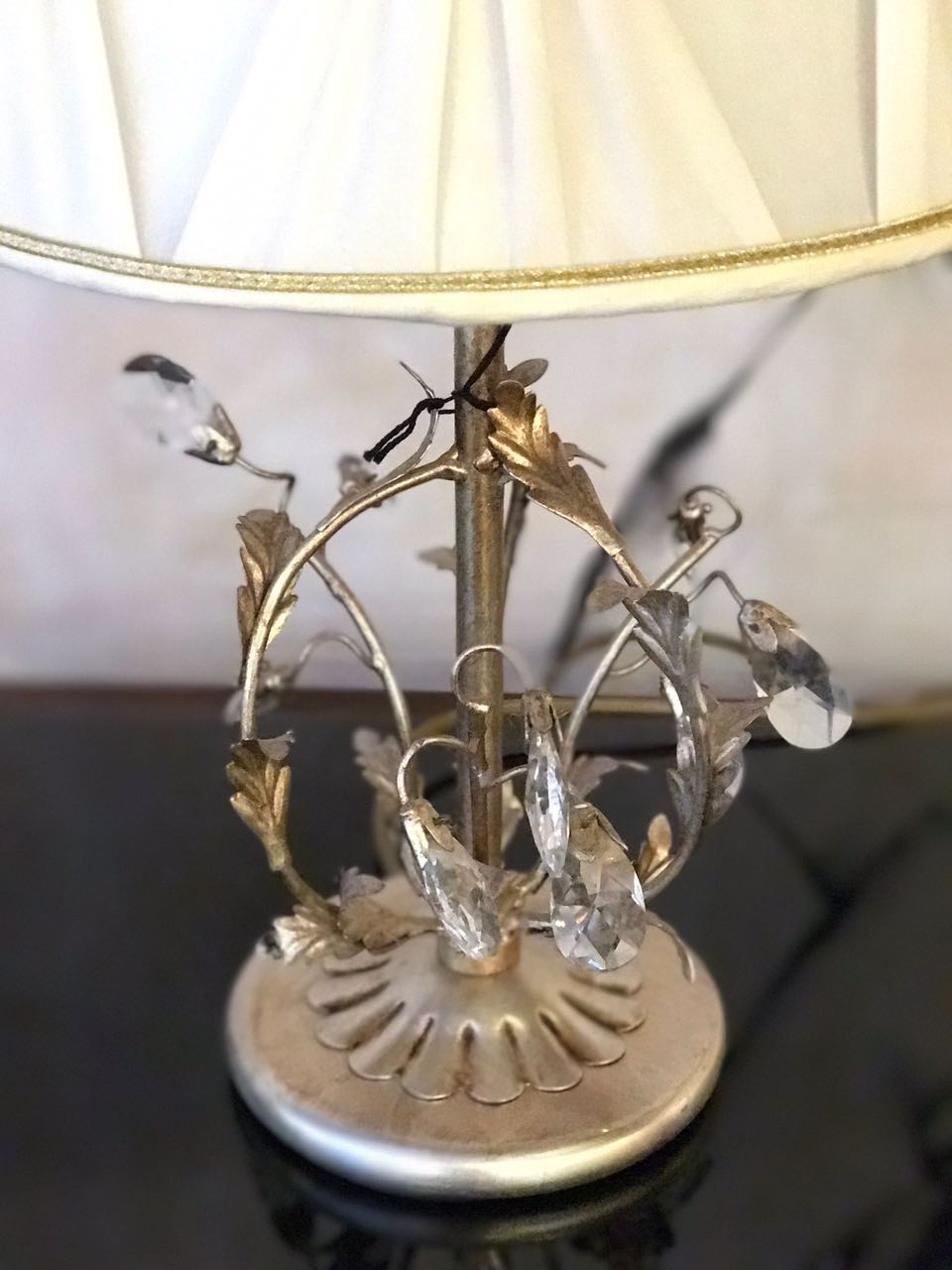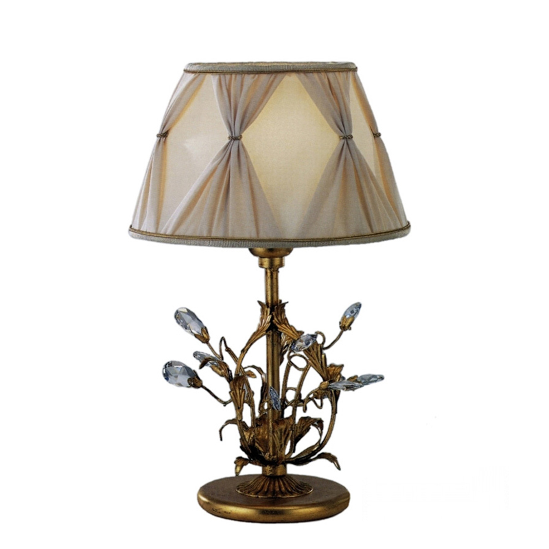 Настольная лампа на металлической арматуре серебряного цвета с золотой патиной. Текстильный абажур бежевого цвета. Декор: прозрачный и фиолетовый хрусталь Swarovski.