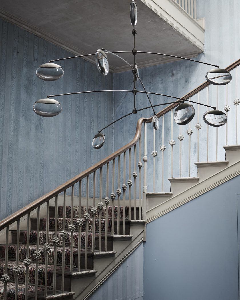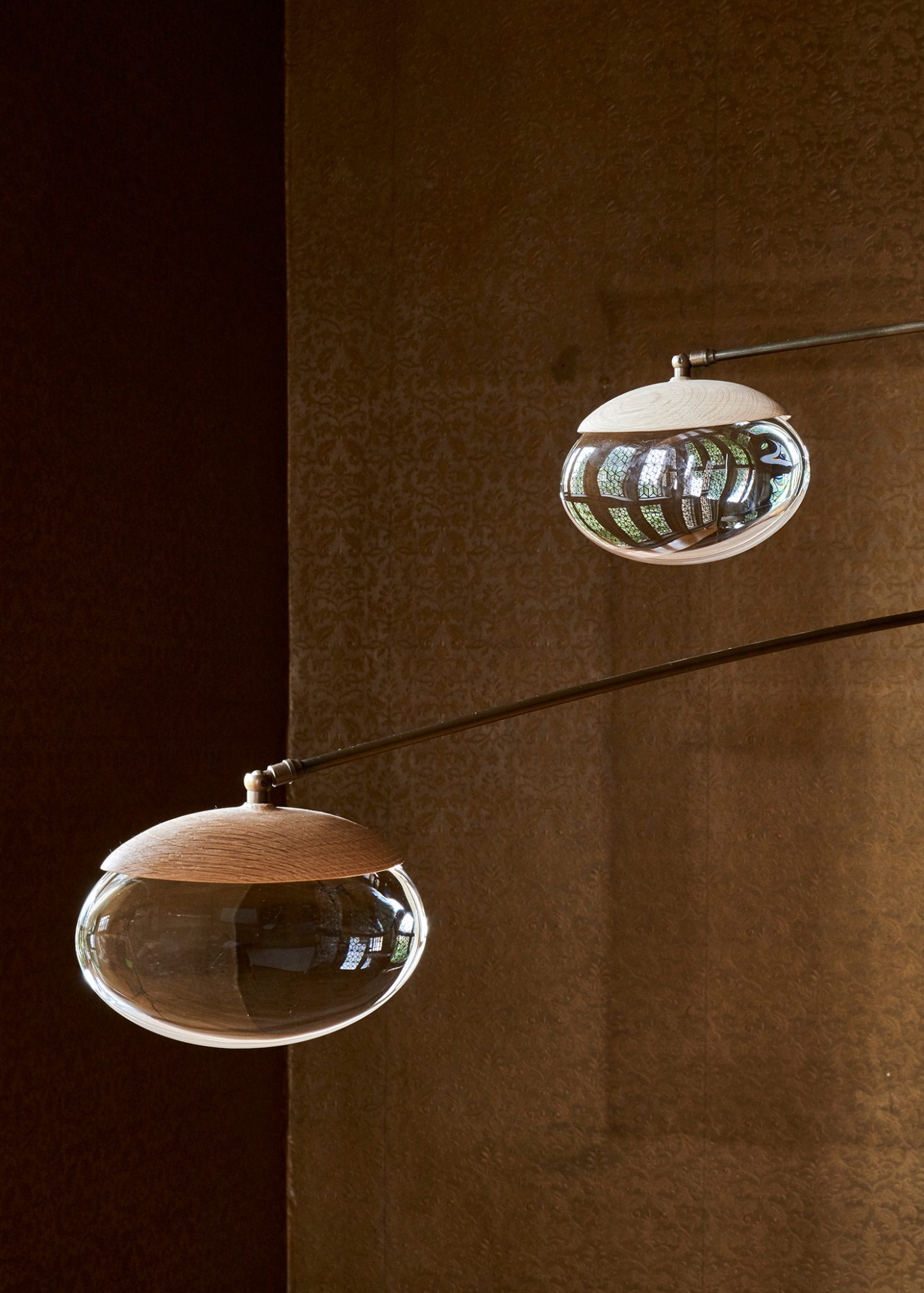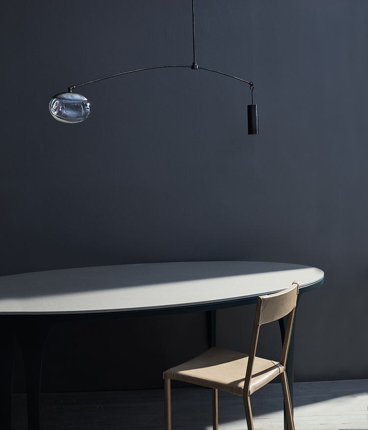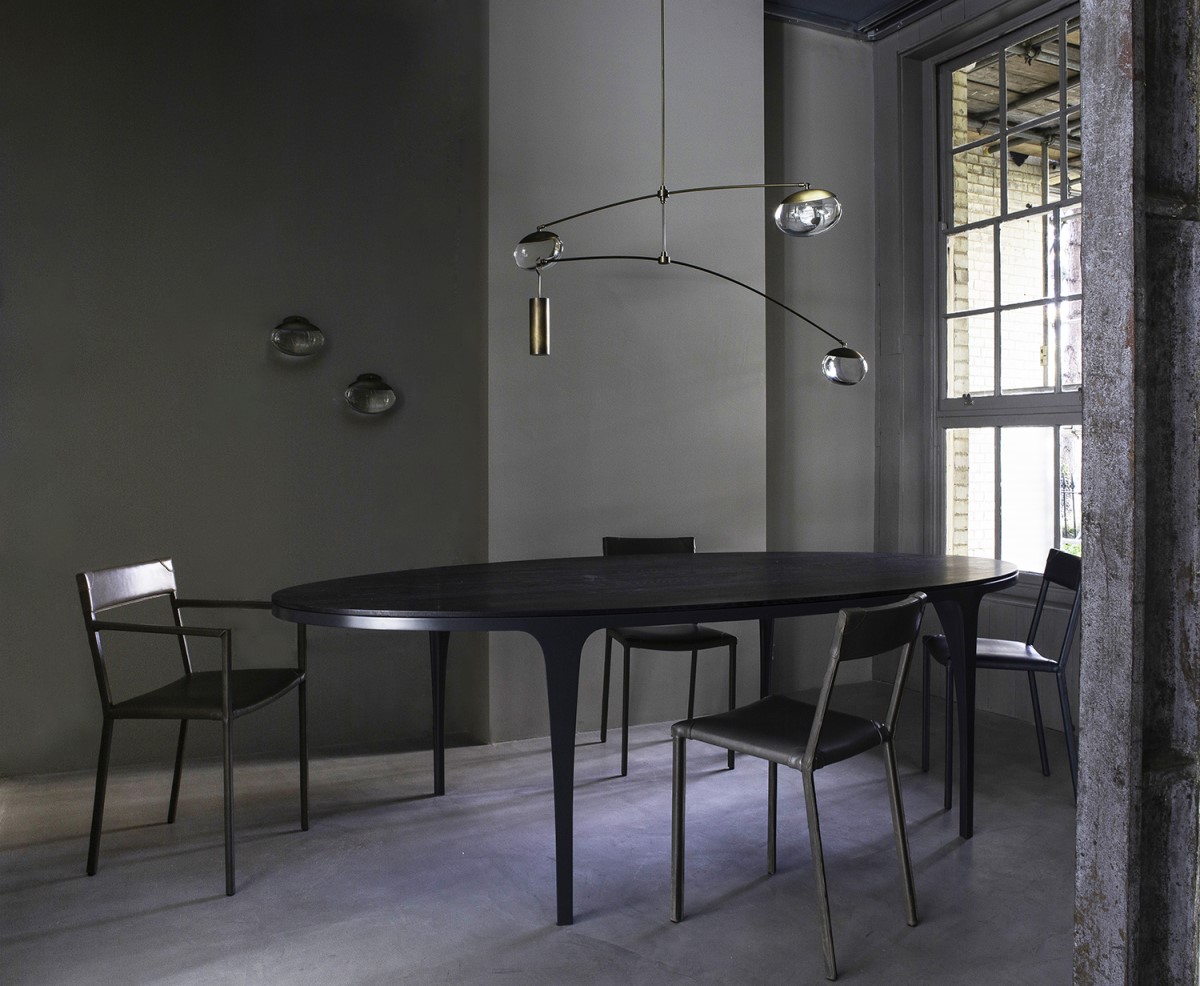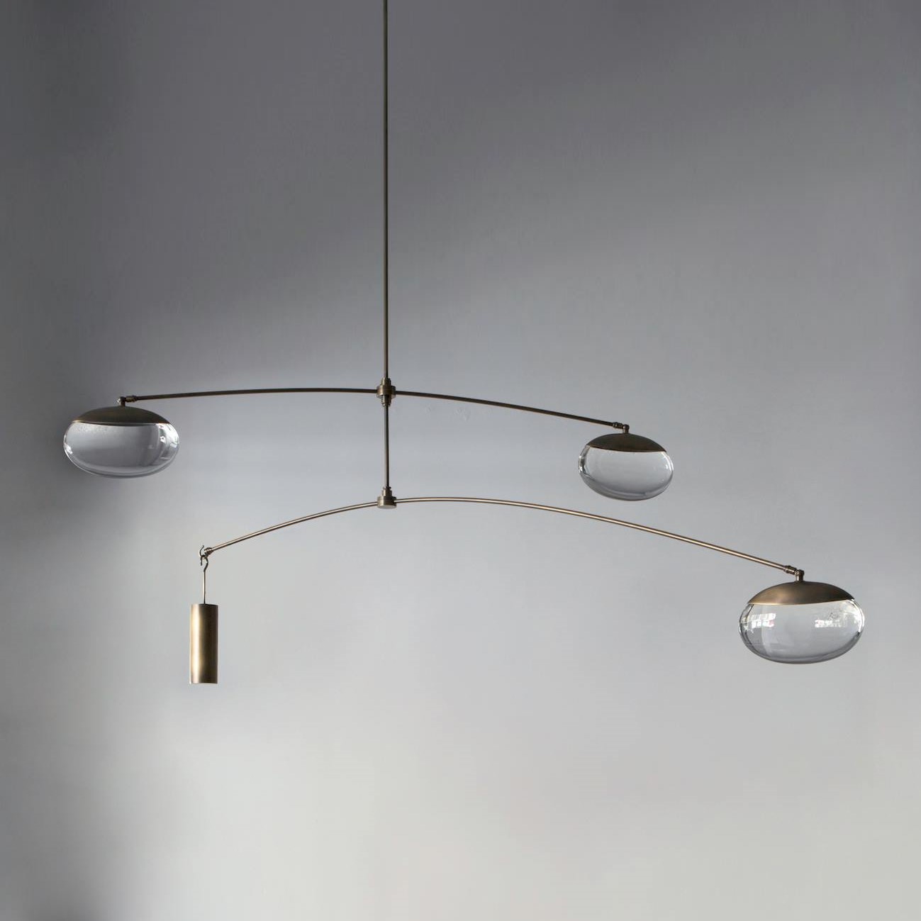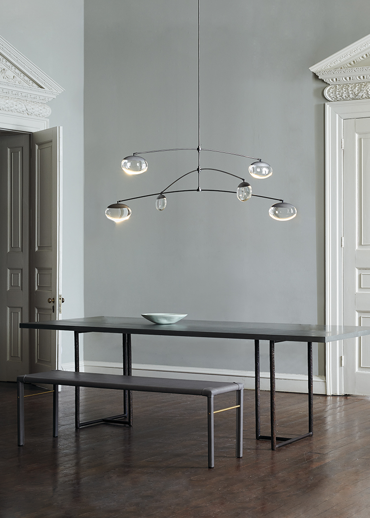 Подвесной светильник OCHRE Gaia в виде трех стеклянных капель, освещенных двумя светодиодами и арматурой цвета черненый никель. Под заказ доступны дополнительные варианты цвета металла: античная латунь, сатинированный никель, а также различные конфигурации моделей.