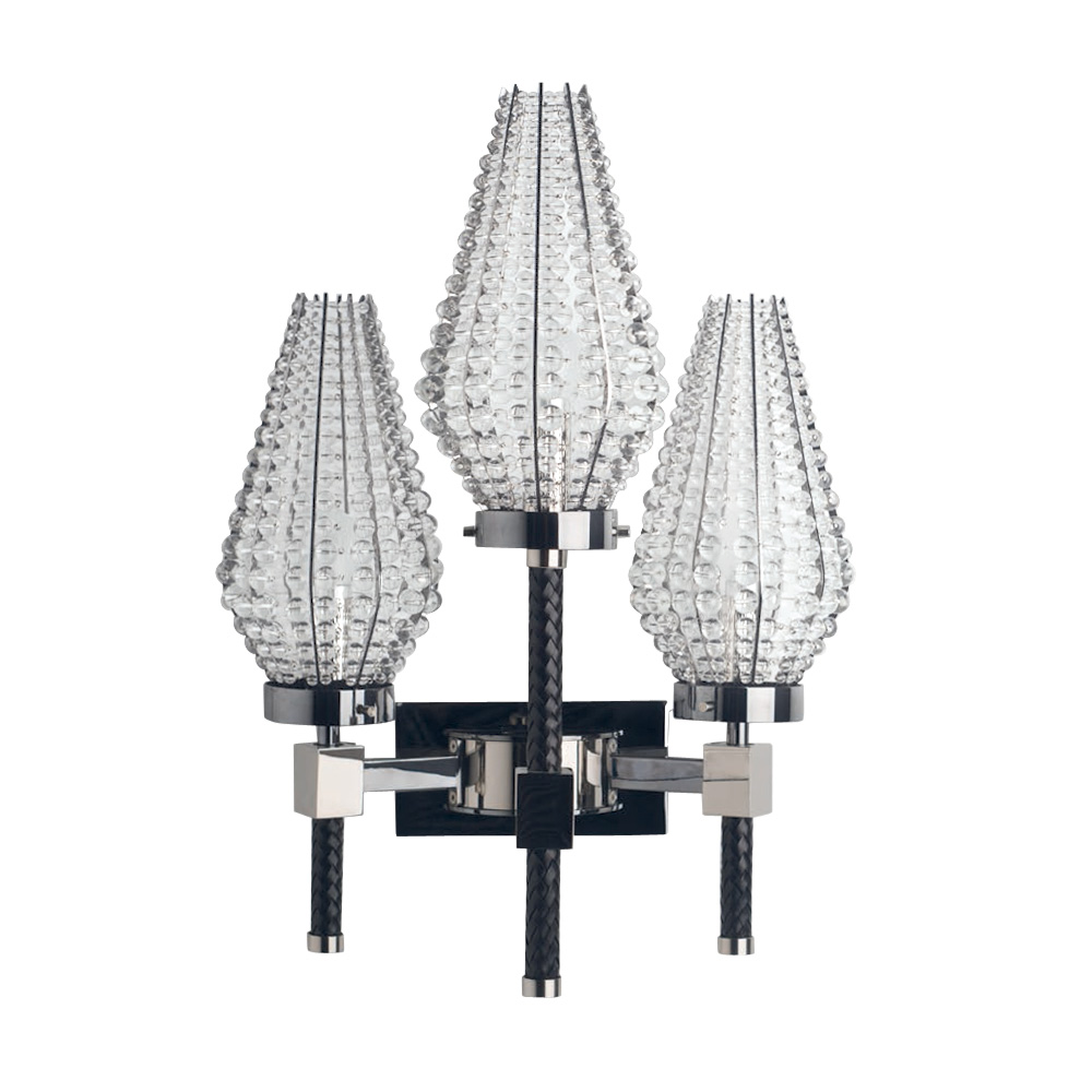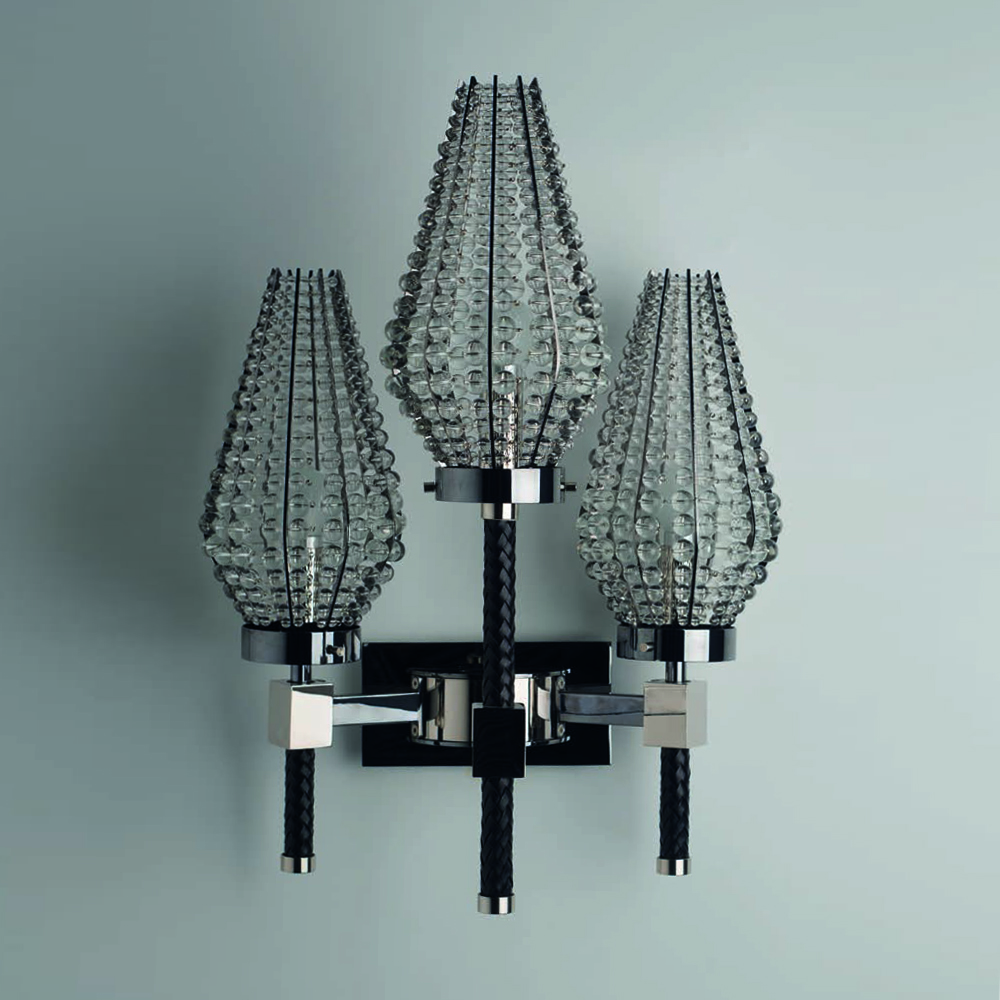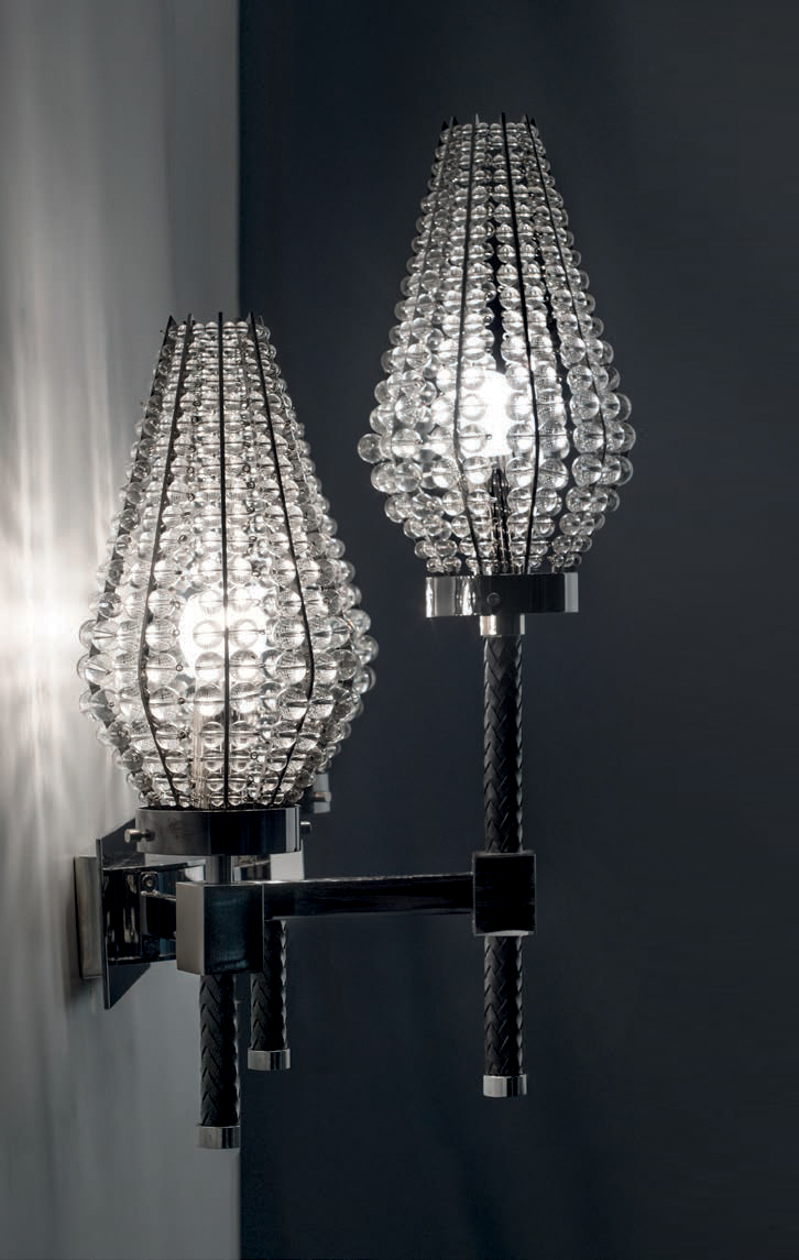 Бра из новой коллекции DEF с абажурами из прозрачных стеклянных бусин. Часть арматуры покрыта плетеной кожей черного цвета. Остальные металлические части арматуры двух цветов: полированного никеля и черного никеля.