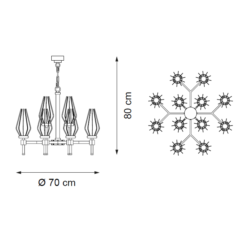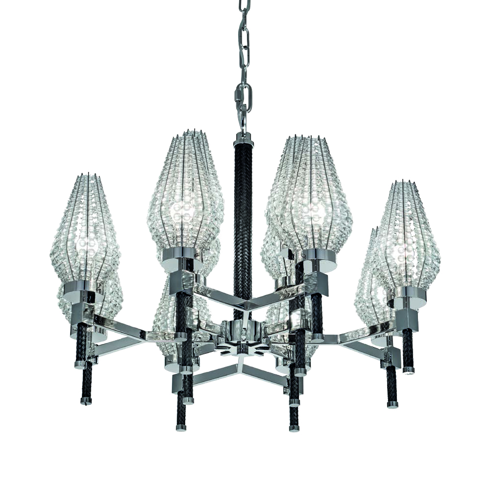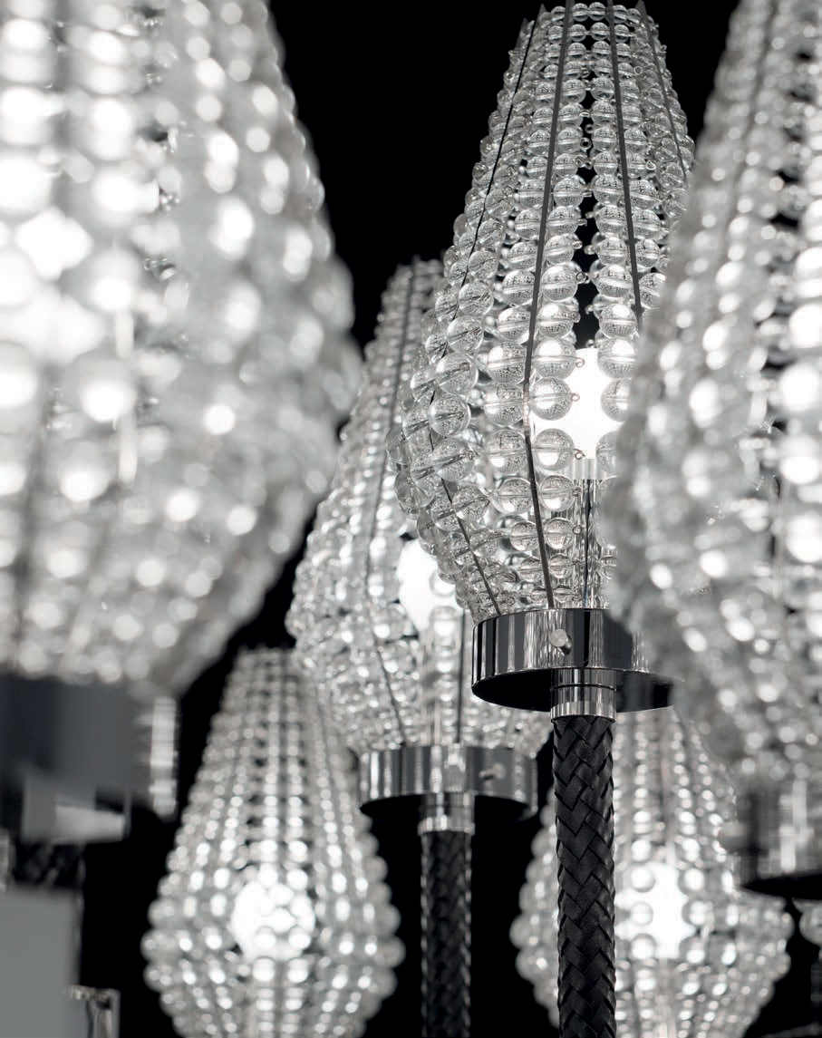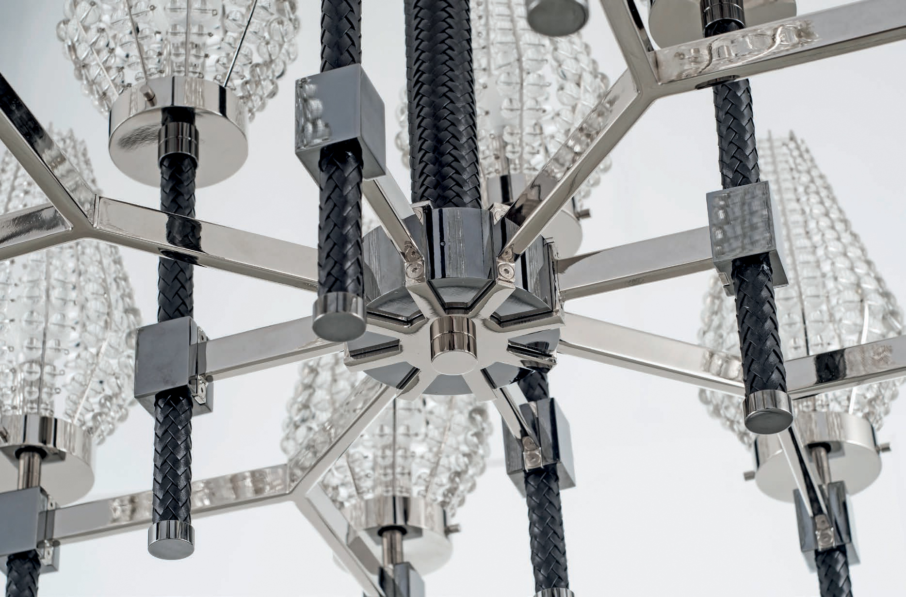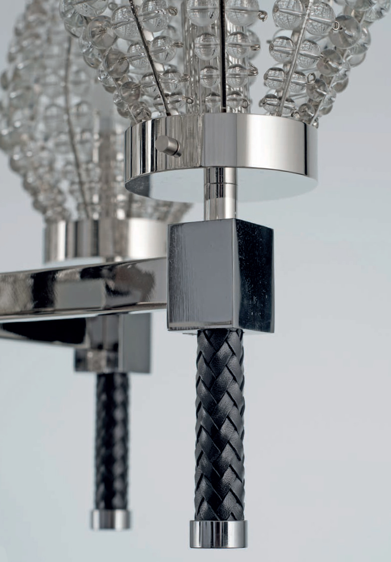 Люстра из новой коллекции DEF с абажурами из прозрачных стеклянных бусин. Часть арматуры покрыта плетеной кожей черного цвета. Остальные металлические части арматуры двух цветов: полированного никеля и черного никеля.