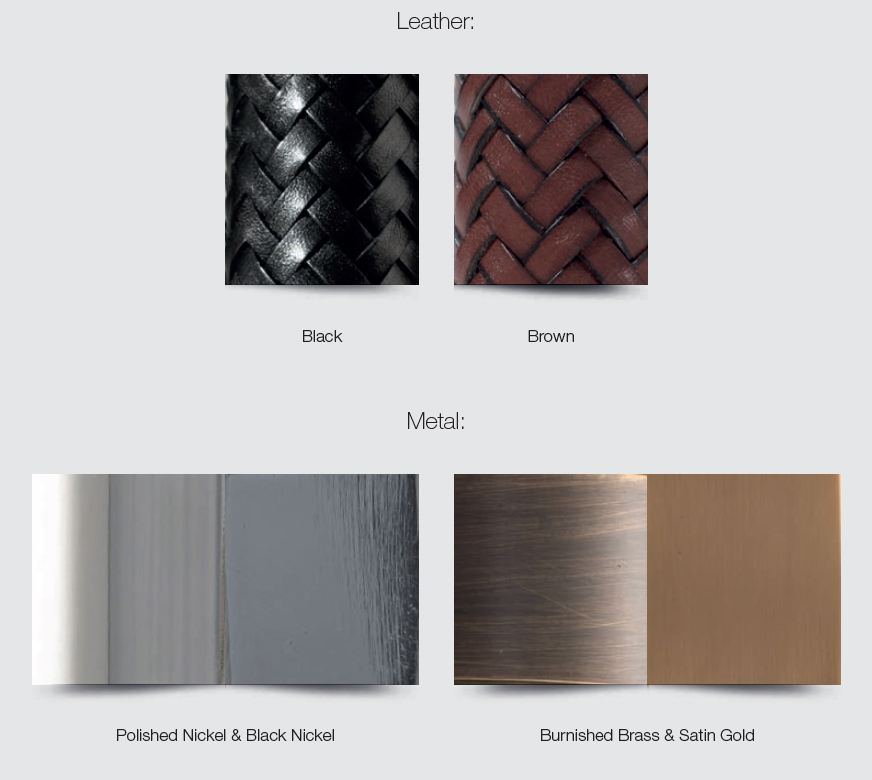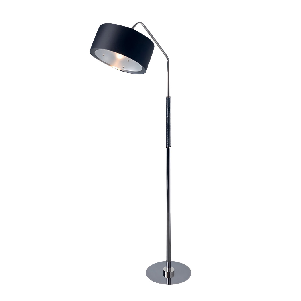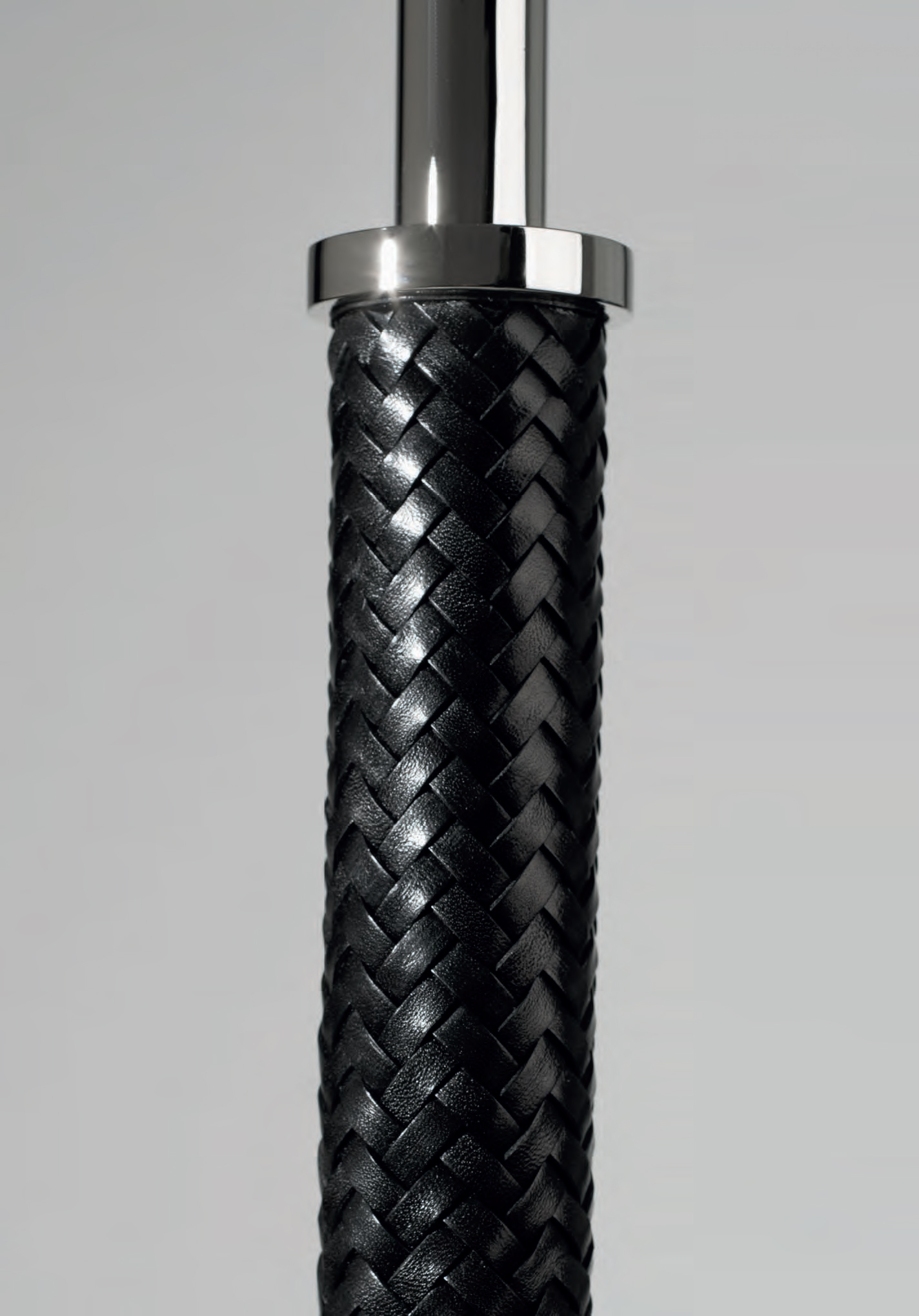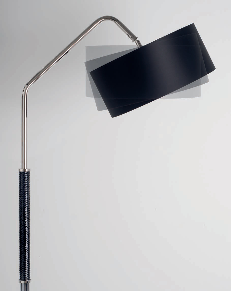 Торшер из новой коллекции DEF с поворотным абажуром черного цвета. Часть основания торшера покрыта плетеной кожей черного цвета. Остальные металлические части двух цветов: полированного никеля и черного никеля.
