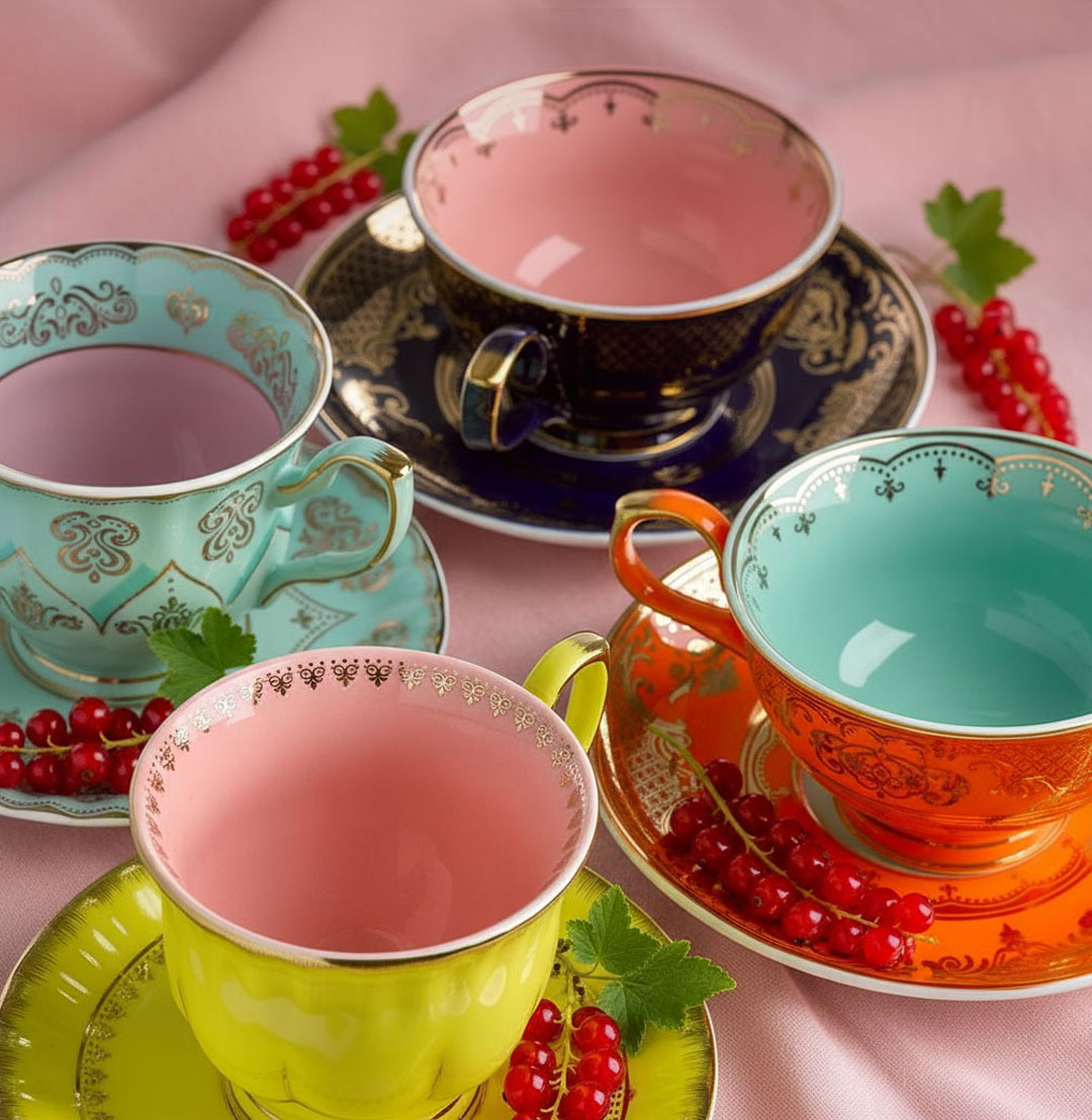 Набор из 4-х чайных пар Tea set Grandpa set 4 разного цвета и дизайна. Оранжевая и синяя пары имеет размеры: чашка 13,5x11,2x7 см, блюдце d17,3x2 см. Желтая и бирюзовая пары: чашка 11,3x8,9x7,6 см, блюдце d14,4x1,3 см. Объем каждой чашки 220 мл