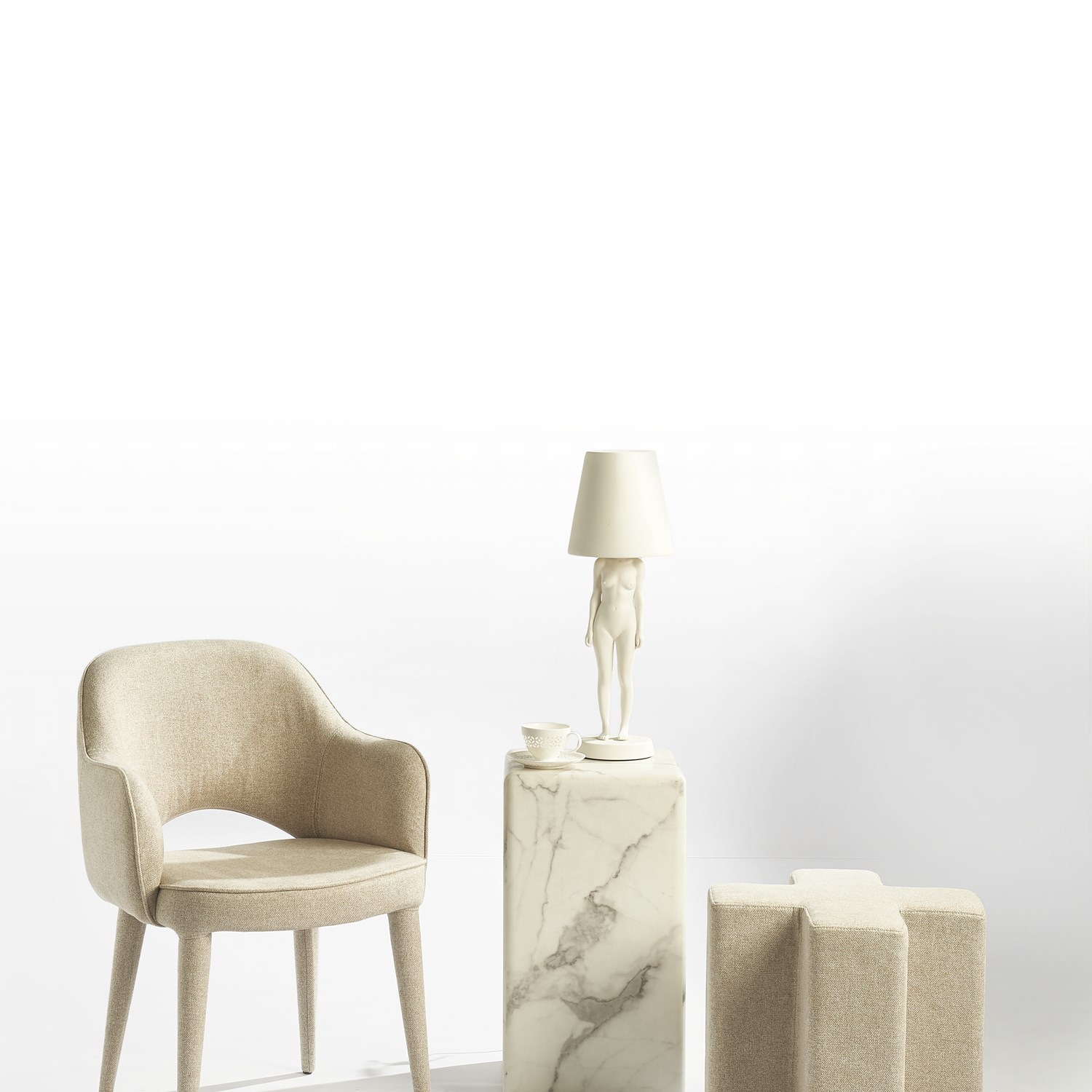 Обеденный стул с подлокотниками, обитый тканью бежевого (экрю) цвета. Именно детали делают этот стул особенным. Ножки покрыты той же тканью бежевого цвета. Состав: 100% полиэстр, огнеупорный (FR cigarette proof). Дизайн: Pols Potten Studio.