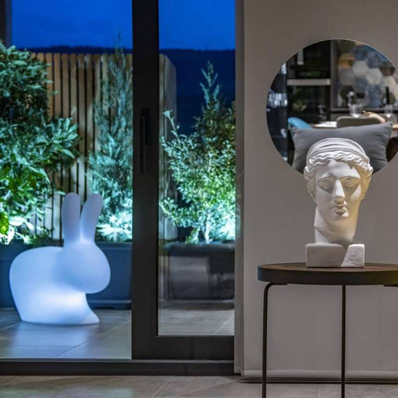 Кресло Rabbit светится! Разработанное Стефано Джованонни и сразу ставшее поп-иконой, его можно использовать как источник света и как кресло. Сидите, прислонившись к ушам, или катайтесь на нем, положив предплечья на его уши. Самые настоящие трюки Qeeboo! Имеет перезаряжаемую батарею, светодиодную подсветку с сенсорным выключателем и прогрессивный диммер.