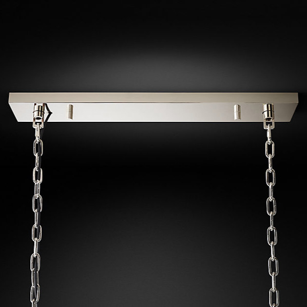 Элегантный светильник в стиле арт-деко 1920-х годов. Прямоугольный каркас люстры выполнен из железа, на котором крепятся сияющие подвески, изготовленные из оптического стекла К9, используемого для изготовления оптических линз и призм.