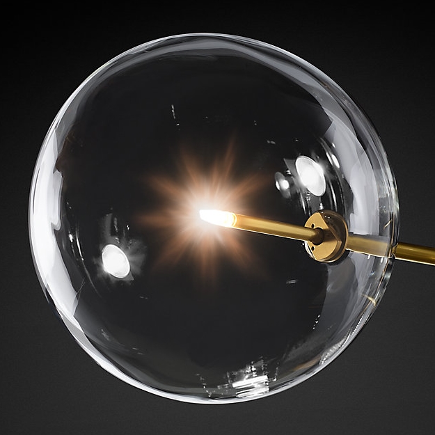 Светильник ручной работы, изготовлен из латунных деталей, на концах которых крепятся стеклянные "плавающие" шары. Положение шаров можно менять и фиксировать в желаемом месте. Высота подвеса может регулироваться. Минимальная высота: 100,33 см, максимальная высота: 190,5 см.