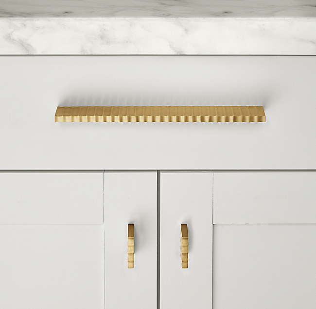 Ручка Helmsley Lacquered Burnished Brass, расстояние между крепежными отверстиями 15.2см. Роскошные линейные ряби из латуни, создают потрясающую игру света и блеска. Подчеркивая ар-деко, чувственный дизайн напоминает об архитектуре конца 1920-х и начала 30-х годов.