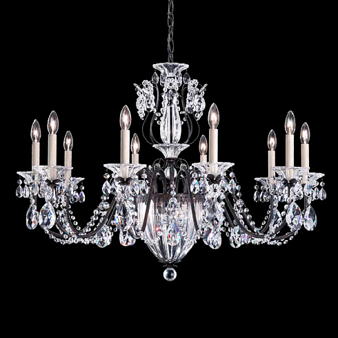 Люстра из коллекции Bagatelle. 10 рожков с лампами свечками. Плафон из из прозрачного хрусталя, в котором располагается еще 3 лампы. Цвет арматуры — бронзовый, прозрачные подвески с кристаллами Heritage Handcut. Есть возможность регулировать высоту люстры за счет звеньев цепи.