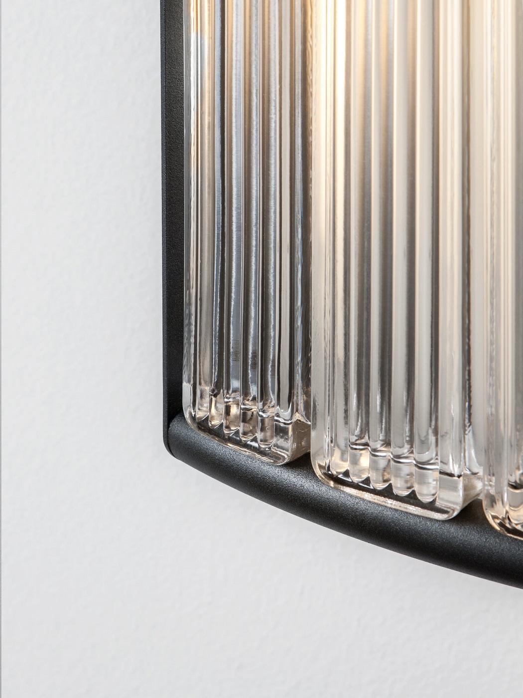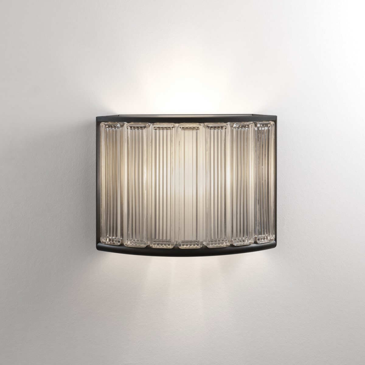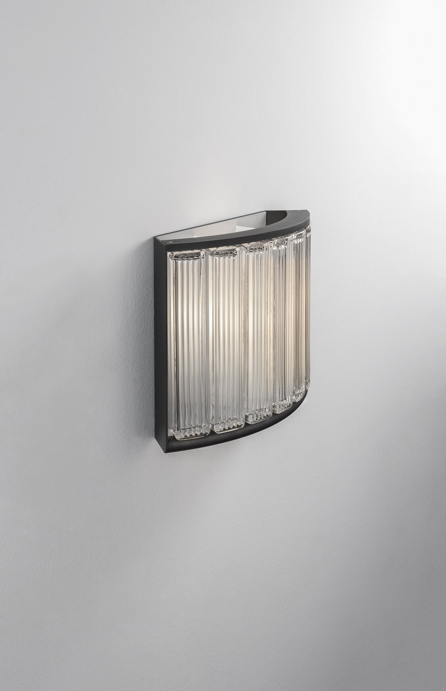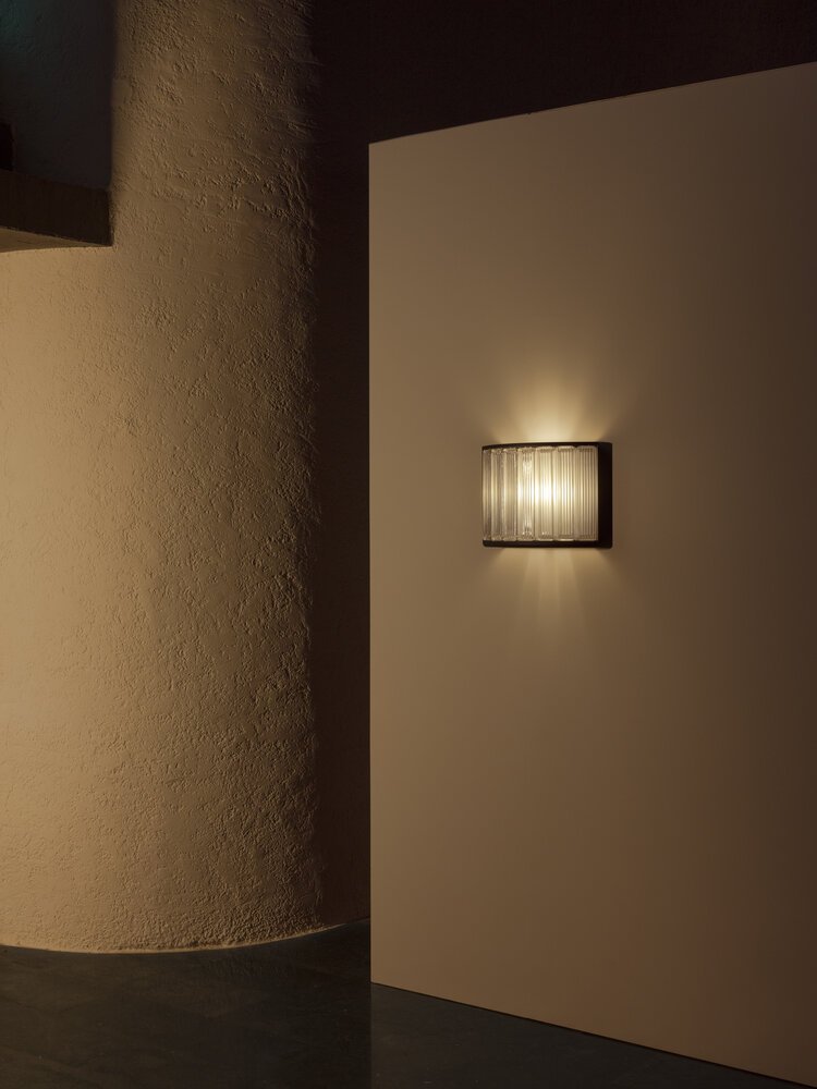 Настенный светильник Santa and Cole Estadio. Текстурированная черная металлическая конструкция с рассеивателем из семи стеклянных блоков.