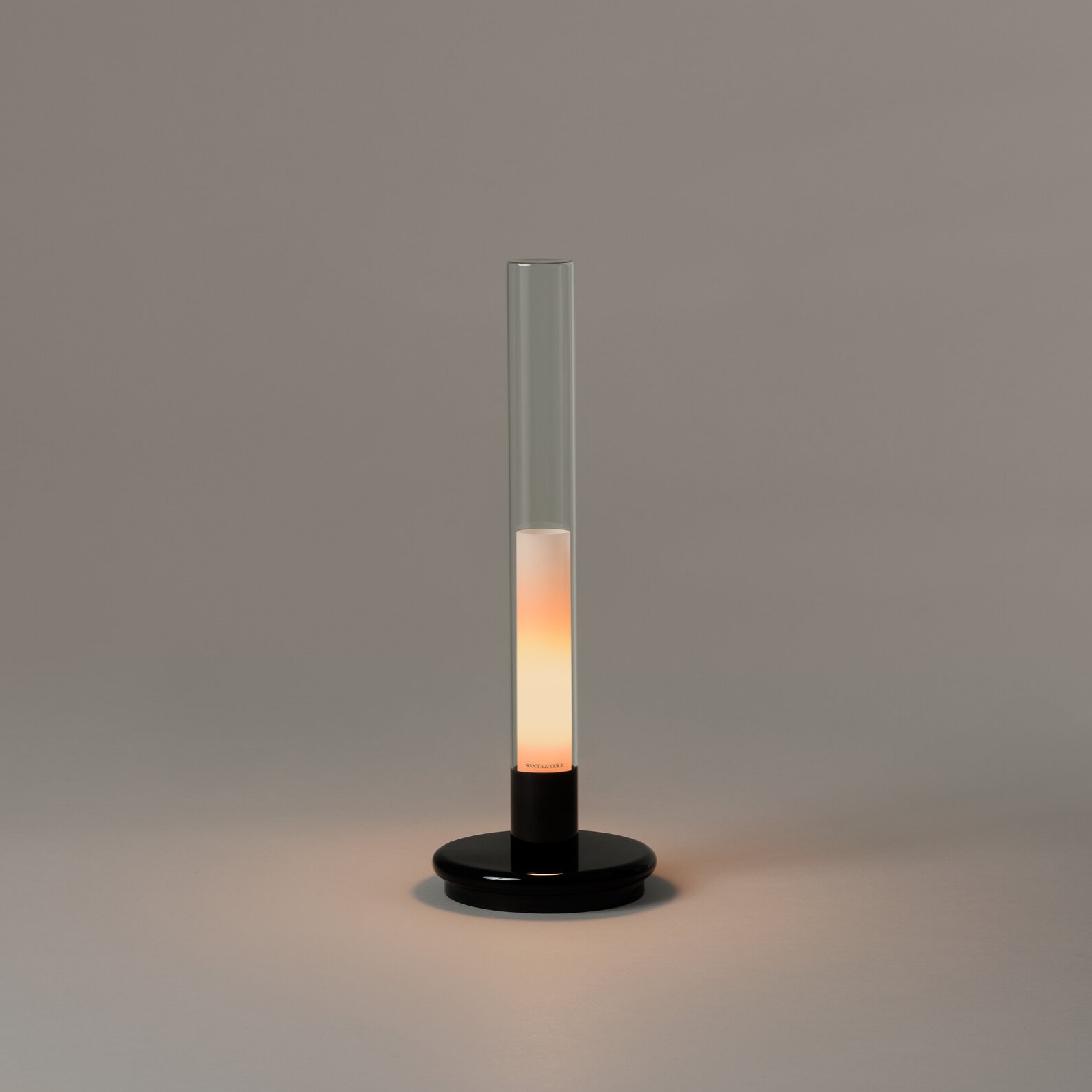 Портативная настольная лампа Santa and Cole Sylvestrina с основанием из металла черного глянцевого цвета и плафоном из прозрачного стекла Pyrex. Рассеиватель из белого полупрозрачного стекла.