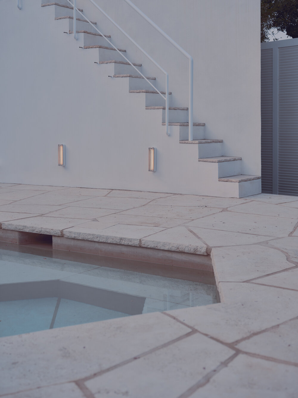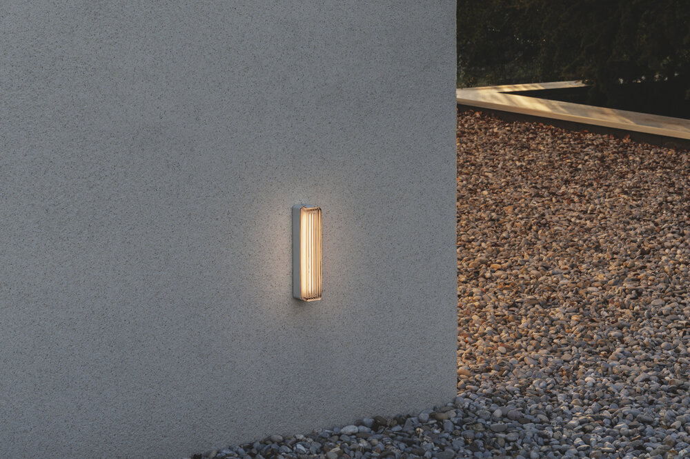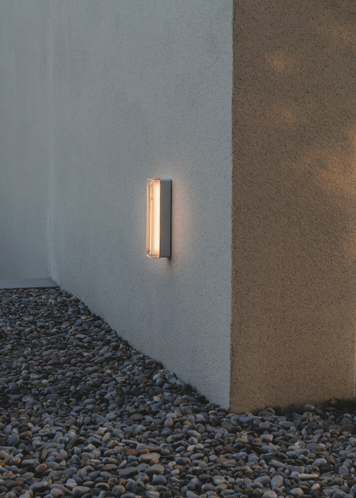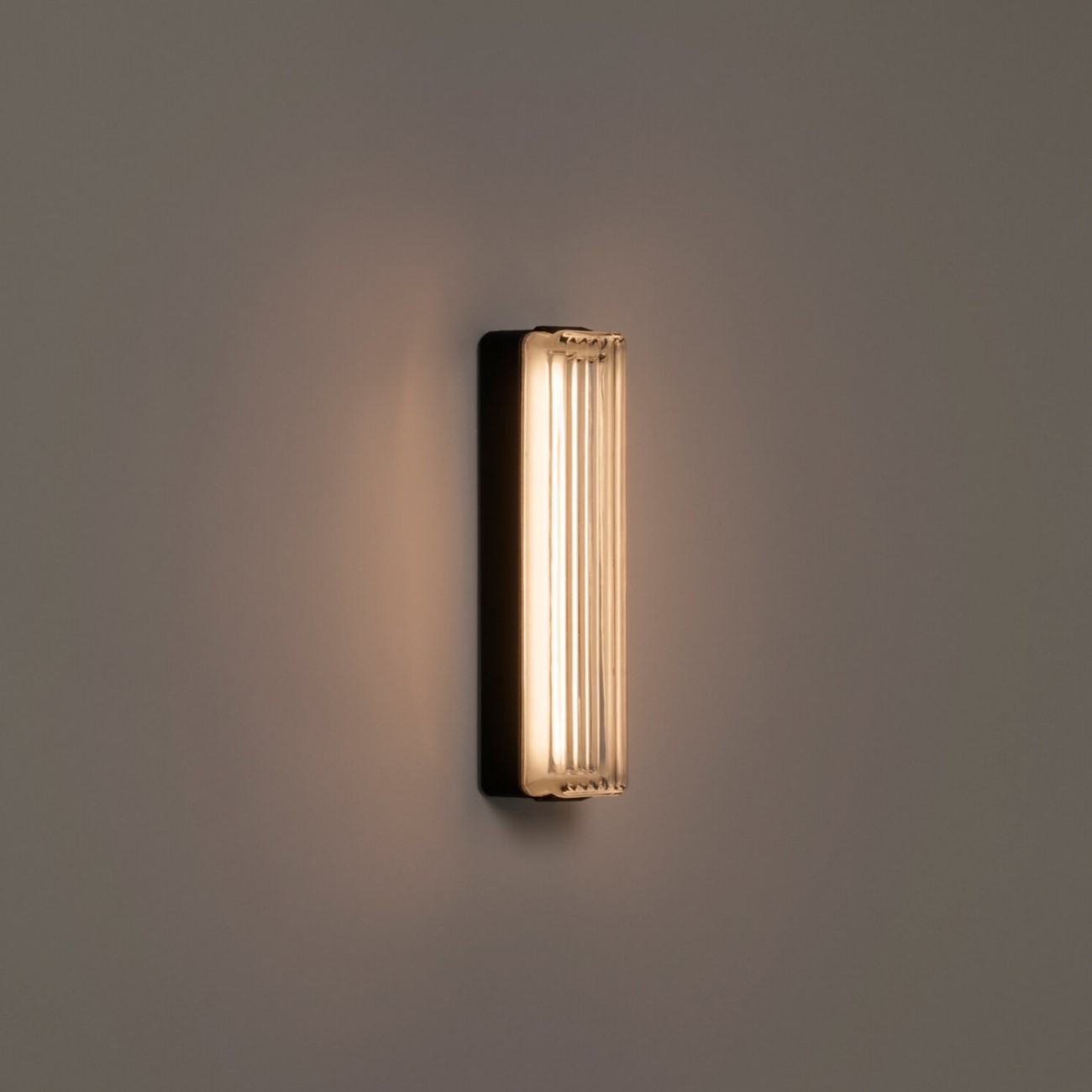 Настенный уличный светильник Santa and Cole Estadio Singular black. Текстурированная черная металлическая конструкция с рассеивателем стеклянного блока.