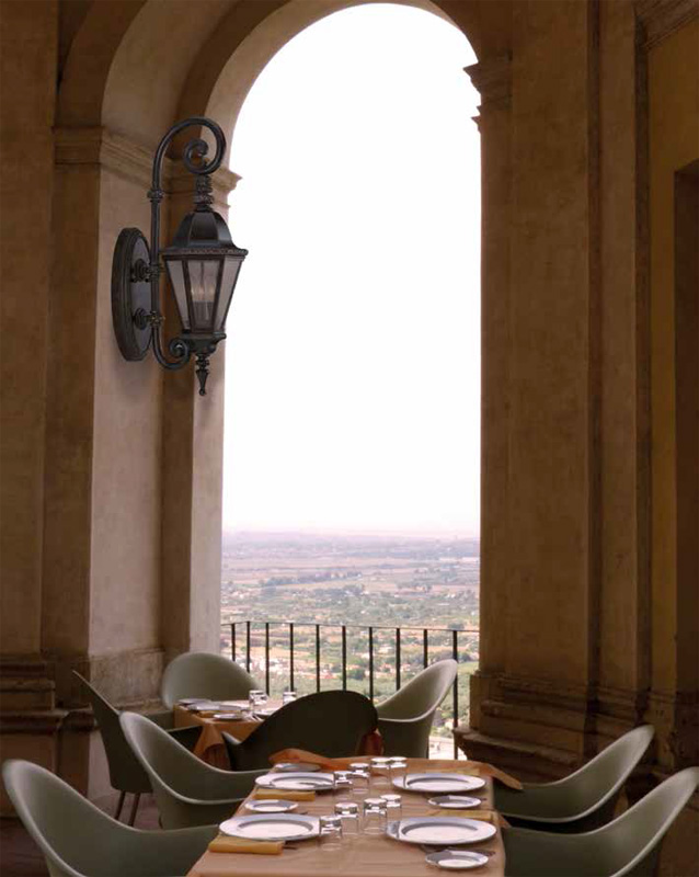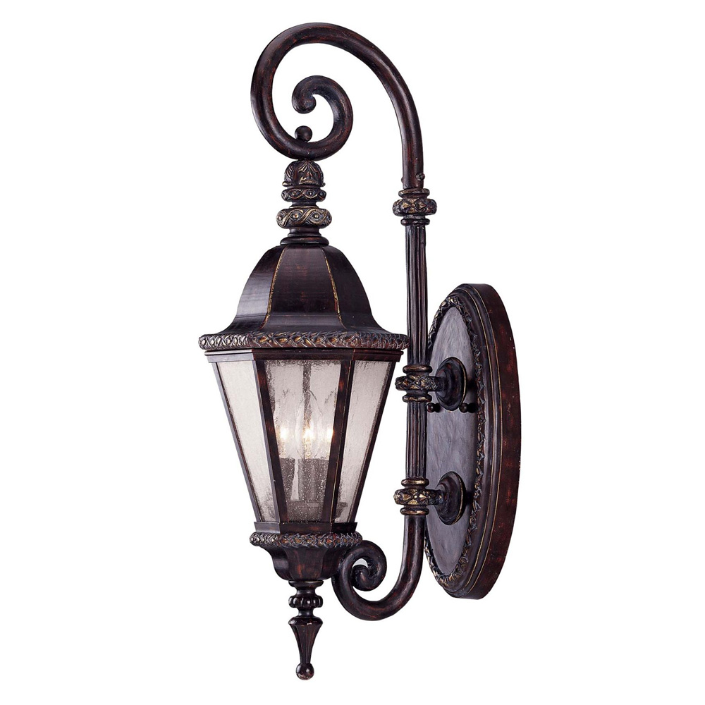 Настенный уличный светильник из коллекции Canterbury выполнен из кованного металла. Створки плафона из прозрачного стекла. Цвет арматуры: коричневый с золотыми потертостями. Дизайн: Karyl Pierce Paxton.