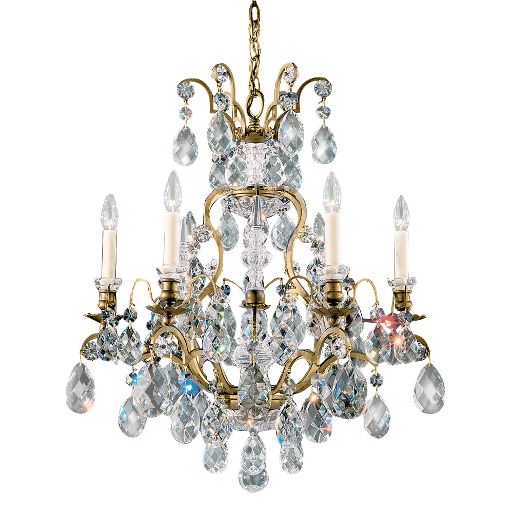 6-ти рожковая люстра на металлической арматуре золотого цвета. Декор: хрусталь Heritage Handcut, изготовлен вручную и отполирован мраморной пылью. Высота светильника регулируется за счет звеньев цепи. Возможны другие варианты хрусталя по типу и цвету, а также различные покрытия металла.