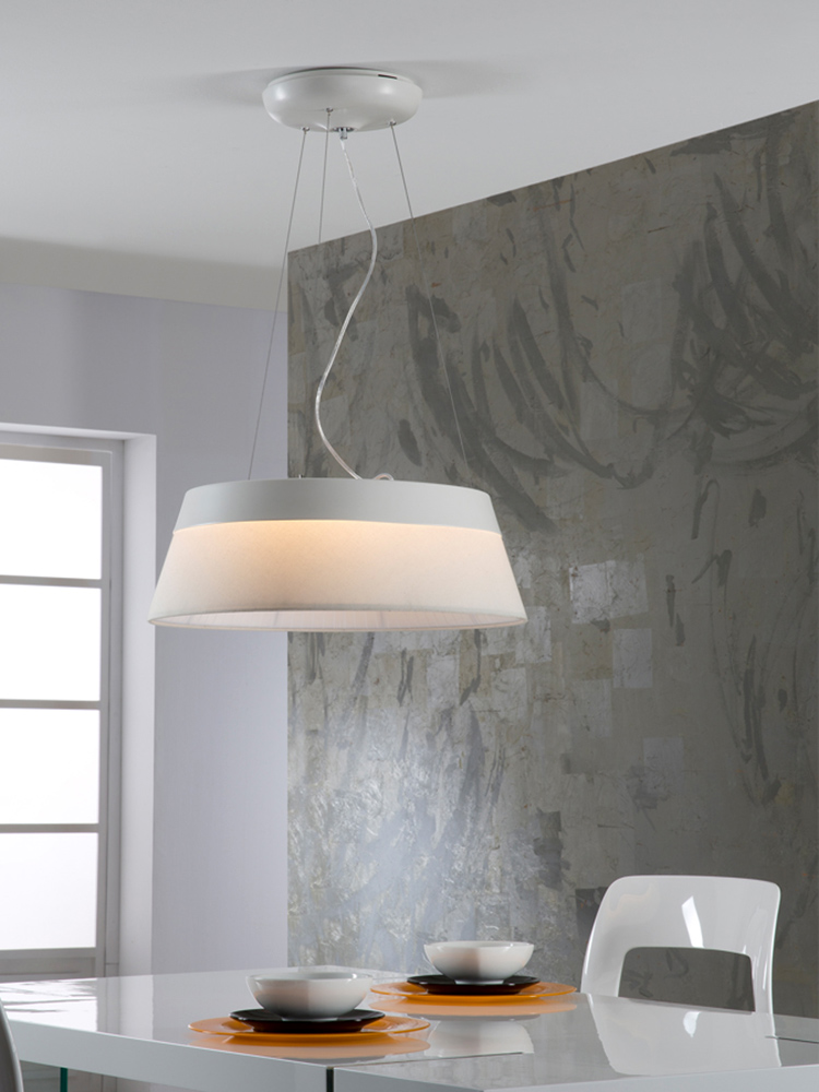 Подвесной светильник из коллекции Swing с основанием из металла, покрытого белым лаком. Двойной плафон снаружи выполнен из тонкого холста натурального льна, а внутри из белого плиссированного шинца. Высота светильника регулируется до 125 см.