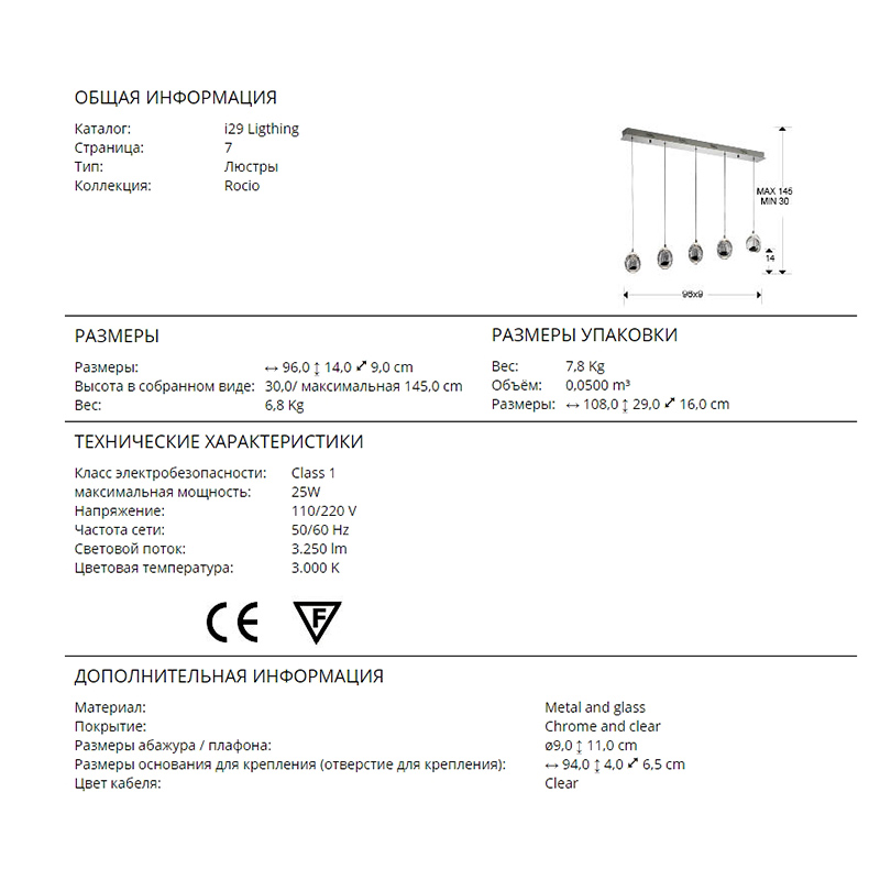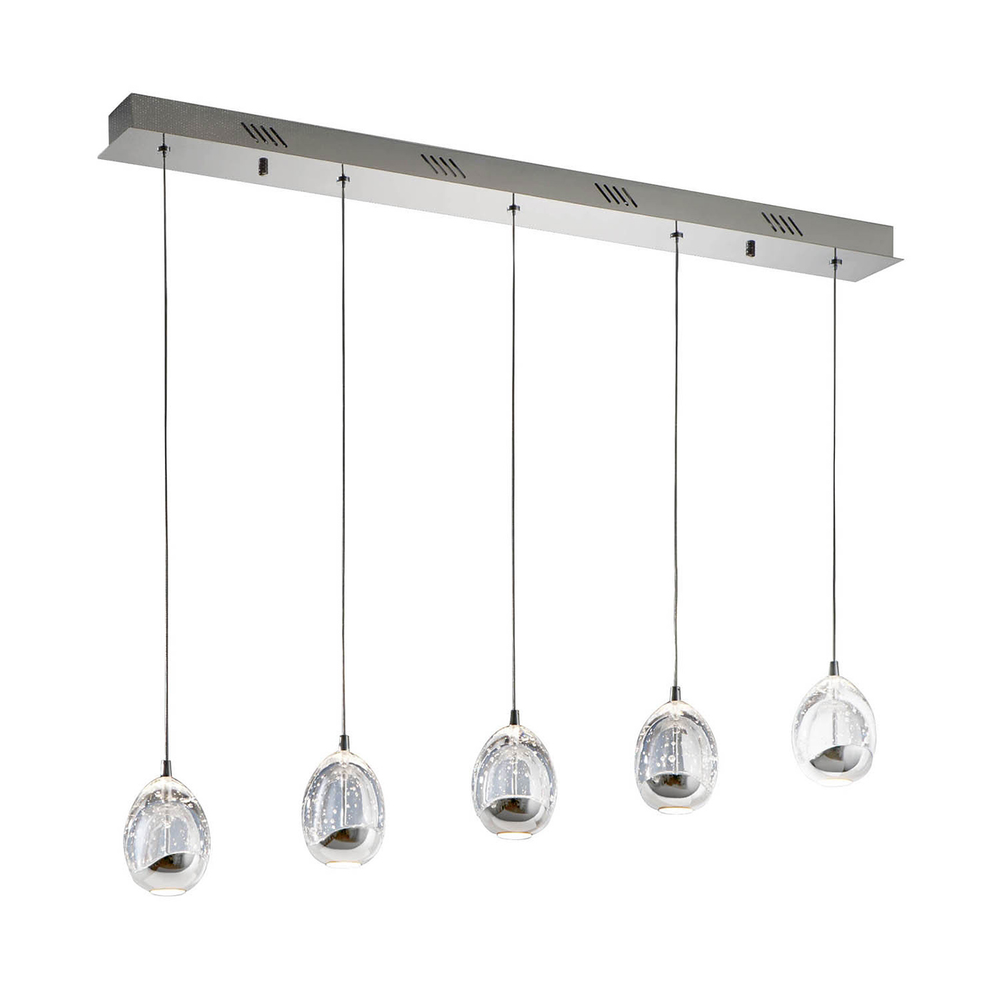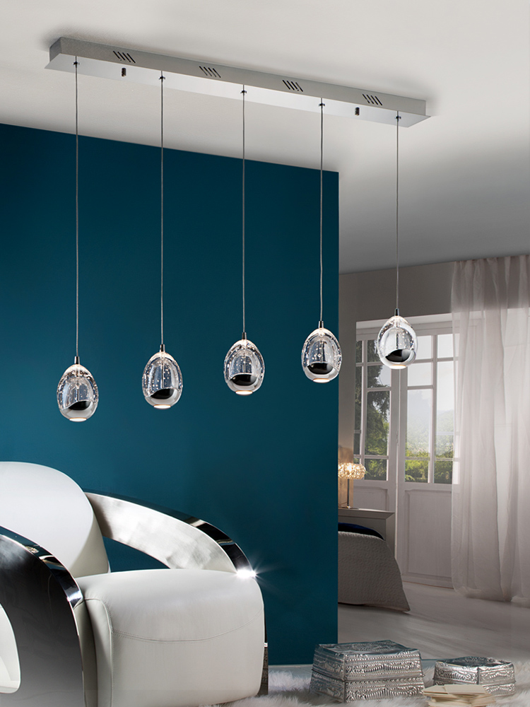 Подвесной светильник из коллекции Rocio на арматуре цвета хром. Плафоны в форме капли из массивного стекла с декоративными пузырьками внутри. Высота светильника регулируется до 145 см.