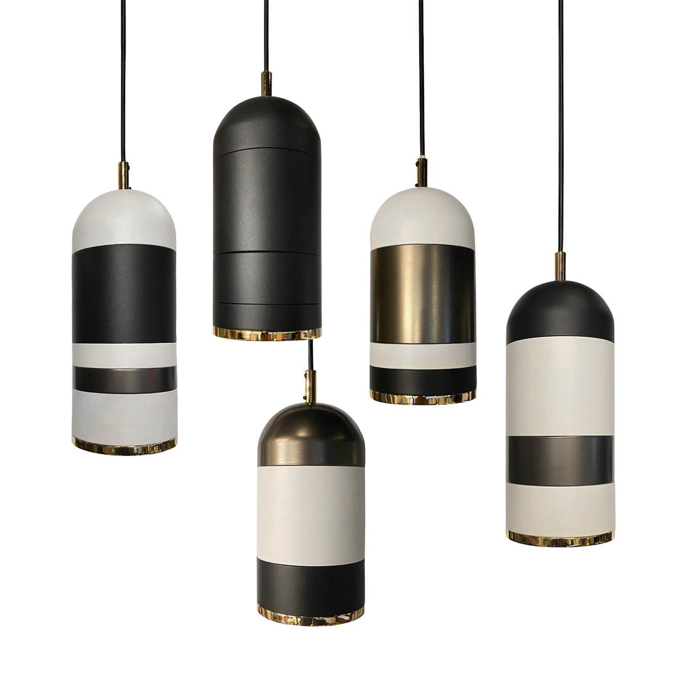 Подвесной светильник из коллекции Elementi из металла белого цвета. Детали подвеса и нижнее тонкое кольцо золотого цвета. Elementi это коллекция-конструктор. С помощью колец разной высоты (10, 5 и 2,5 см), которые доступны в различных цветах, можно создавать уникальные светильники и композиции. Дизайн: Ольга Подольская