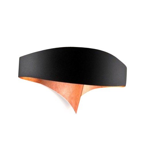 Настенный светильник Scudo из изогнутого металлического листа черного цвета снаружи и медного - внутри.