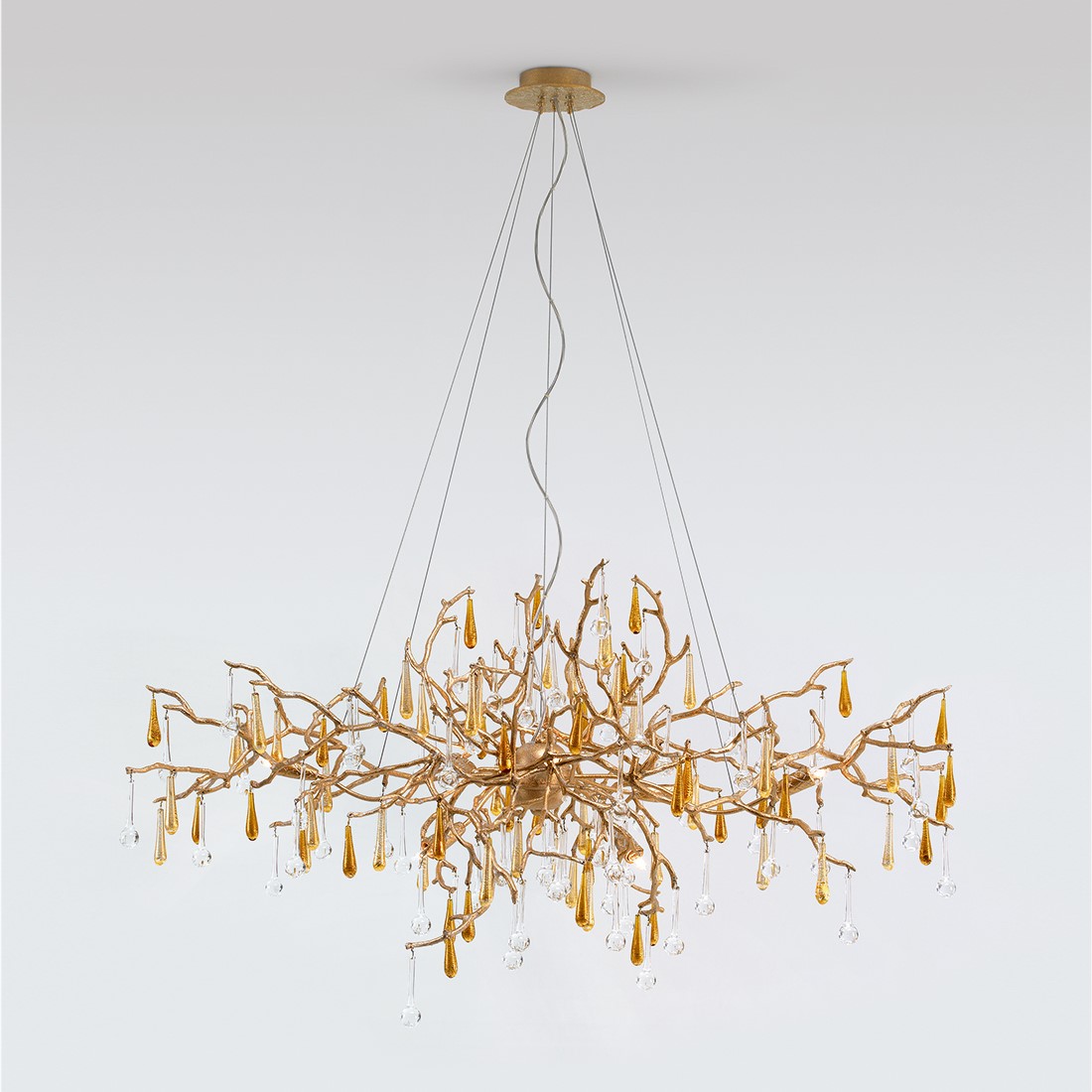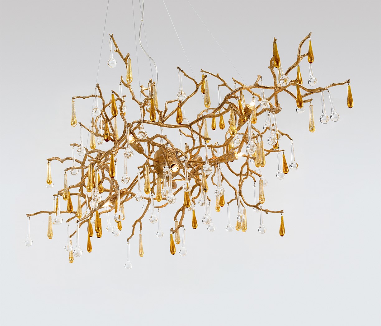 Подвесной светильник из коллекции Bijout выполнен из металла золотого цвета. Дизайн в виде дерева со сплетением ветвей. Сверкающие подвески-капли из стекла ручной работы на ветвях. Цвет стекла 10 (прозрачный) в соответствии с палитрой. Все стекло для светильников Serip изготавливается и формируется вручную. Кстати, в стекле полностью отсутствует свинец и это сильно усложняет работу мастеров, так как именно свинец делает стекло эластичным. Такое неэластичное стекло невозможно выдувать и фабрике пришлось разработать свои уникальные технологии работы со стеклом. Отказ от свинца и замена его органическим аналогом является важным шагом для сохранения здоровья человека и экологии. Высоту светильника можно регулировать от 70 до 330 см. Идеальные пропорции и изящные линии сочетают в себе классические традиции и новаторство нашего времени. Изделия Serip имеют органичные формы и цвета, вливаются в интерьер, делая его утонченнее и ярче. Возможны другие варианты по цвету стекла и покрытию металла.