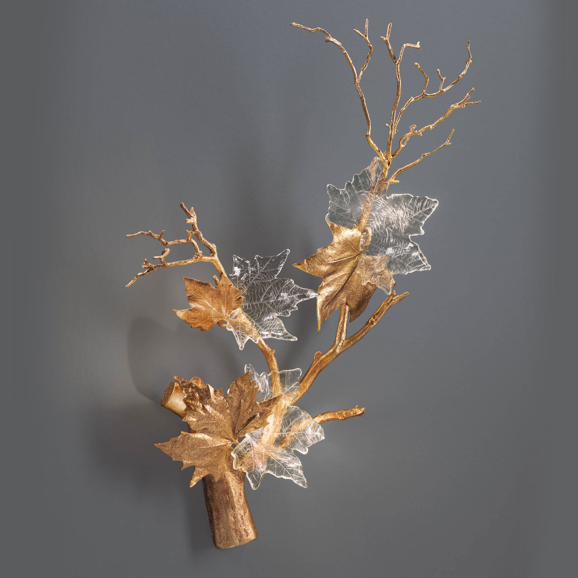 Настенный светильник Serip Folio. Красота застывшего момента, подсмотренная у природы, и естественные формы с узорами прожилок создают поистине очаровательный дизайн. Контраст между листами — хрупким стеклянным и непрозрачным металлическим — делают этот светильник настоящим произведением искусства и желанным декоративным элементом в любом интерьере. Утонченный и сложный дизайн этой модели относится к произведениям, представляющим собой художественное отражение природы. Цвет металлического листа может меняться, варианты вы увидите в дополнительных фотографиях.