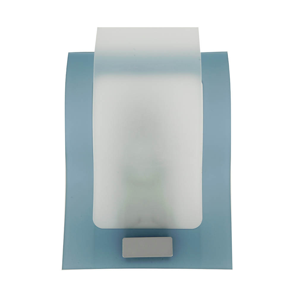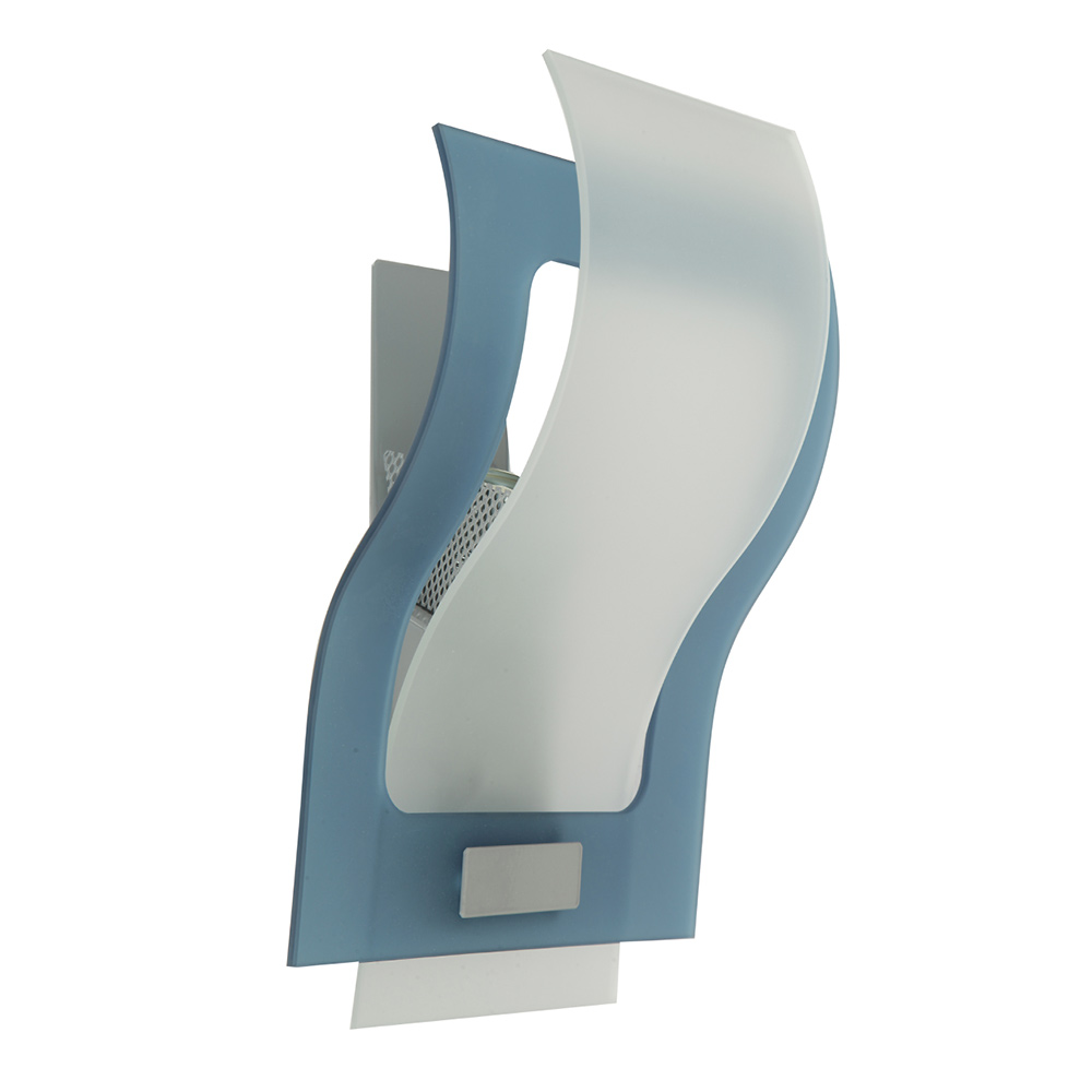 Настенный светильник на металлической арматуре. Плафон выполнен из комбинирования стекла белого и голубого цветов. Цвет арматуры: серый.