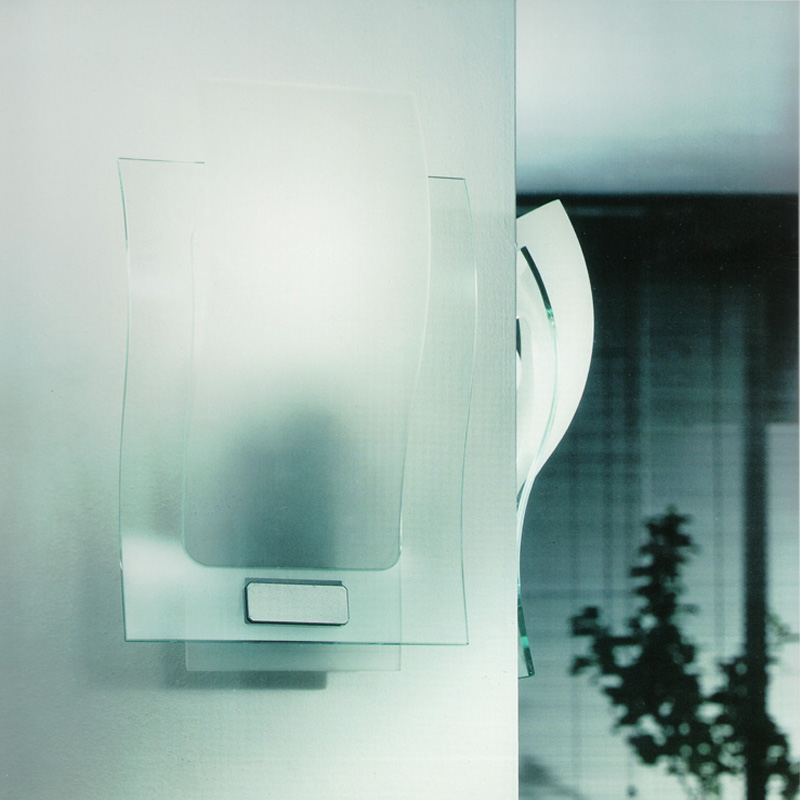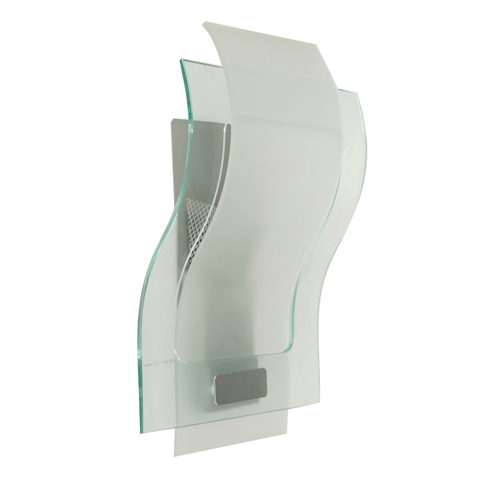 Настенный светильник на металлической арматуре. Плафон выполнен из комбинирования белого стекла и прозрачного. Цвет арматуры: серый с хромированными деталями.