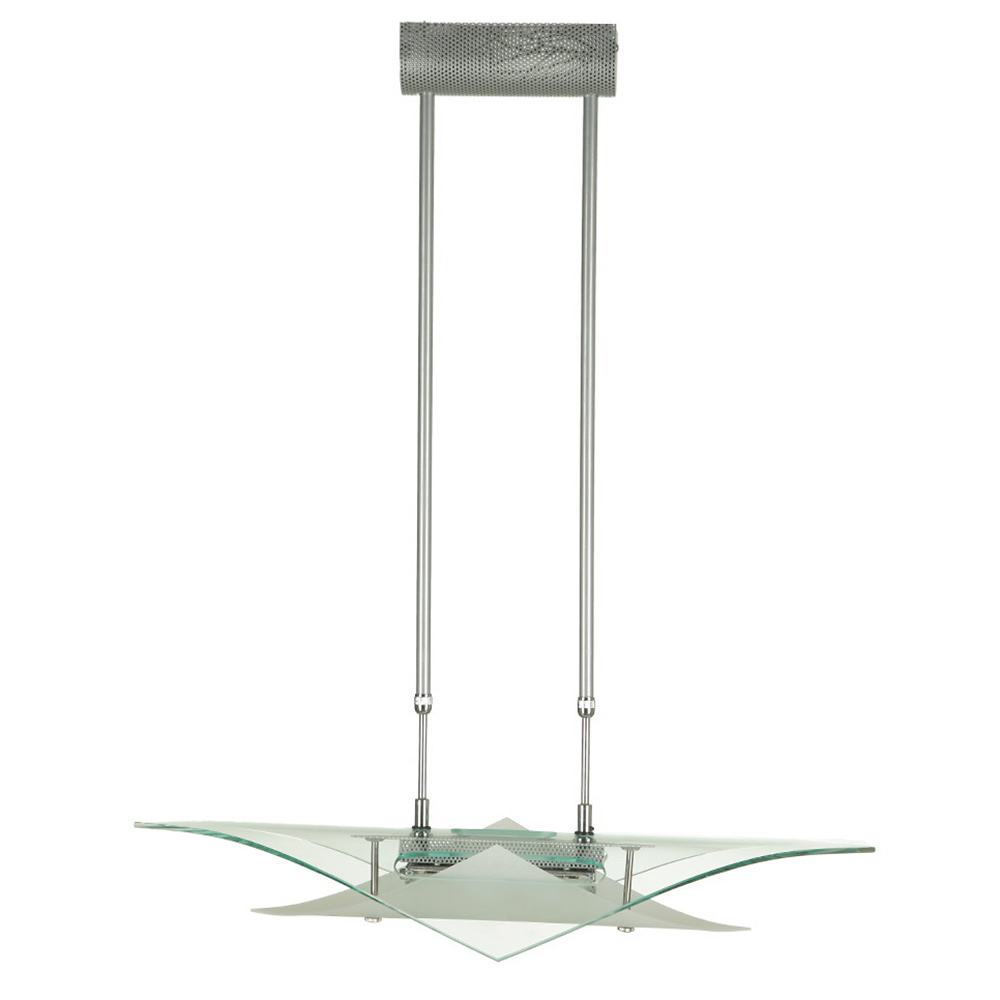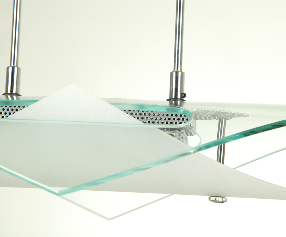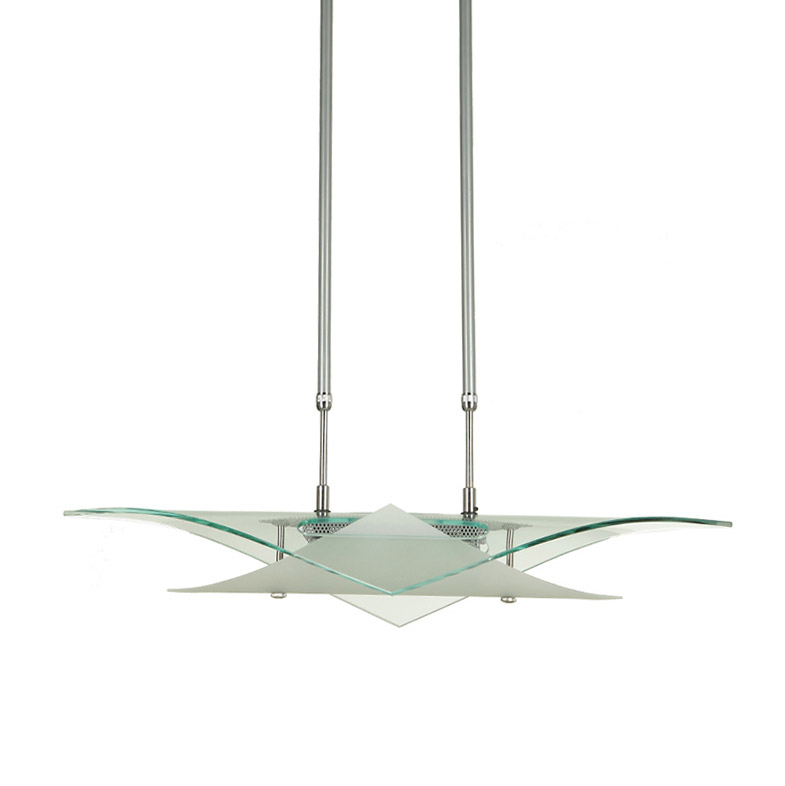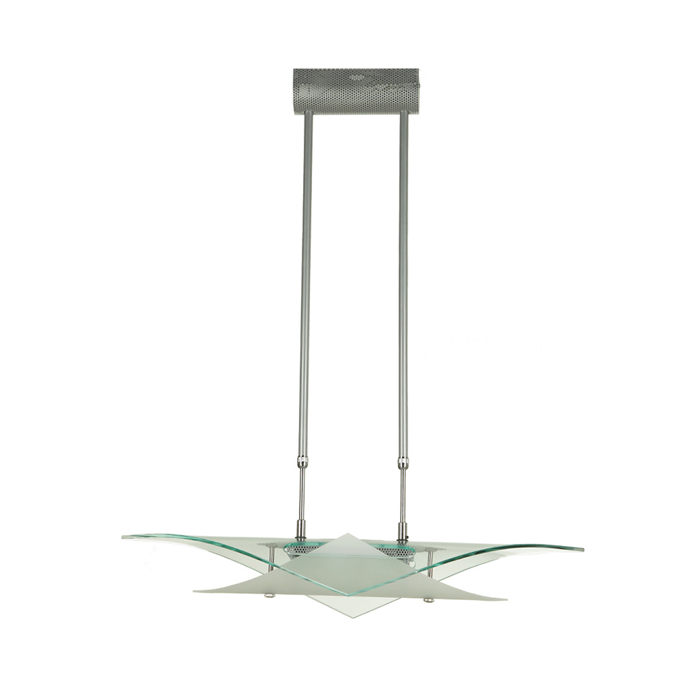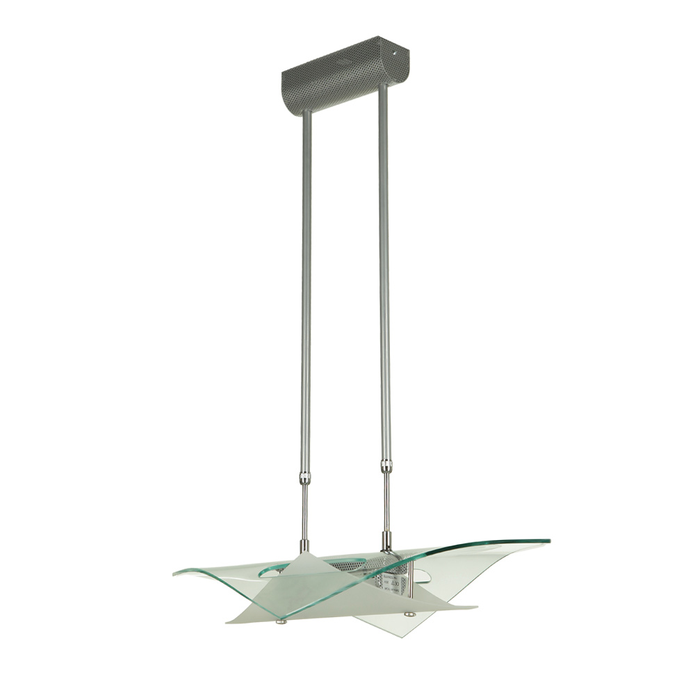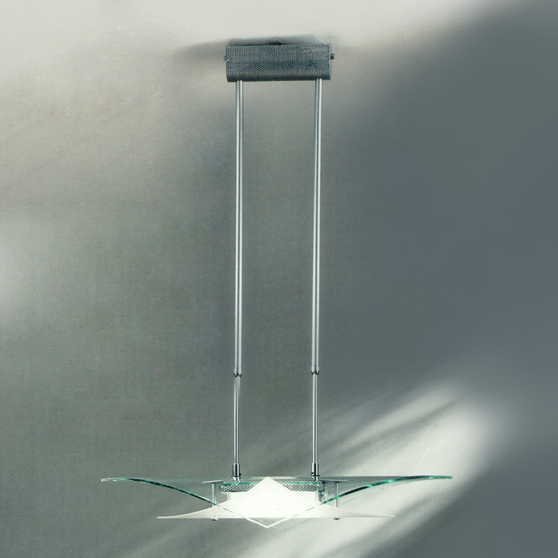 Подвесной светильник на металлической арматуре. Плафон выполнен из комбинирования белого и прозрачного стекла. Цвет арматуры: серый хром. Высота светильника регулируется до 122 см.