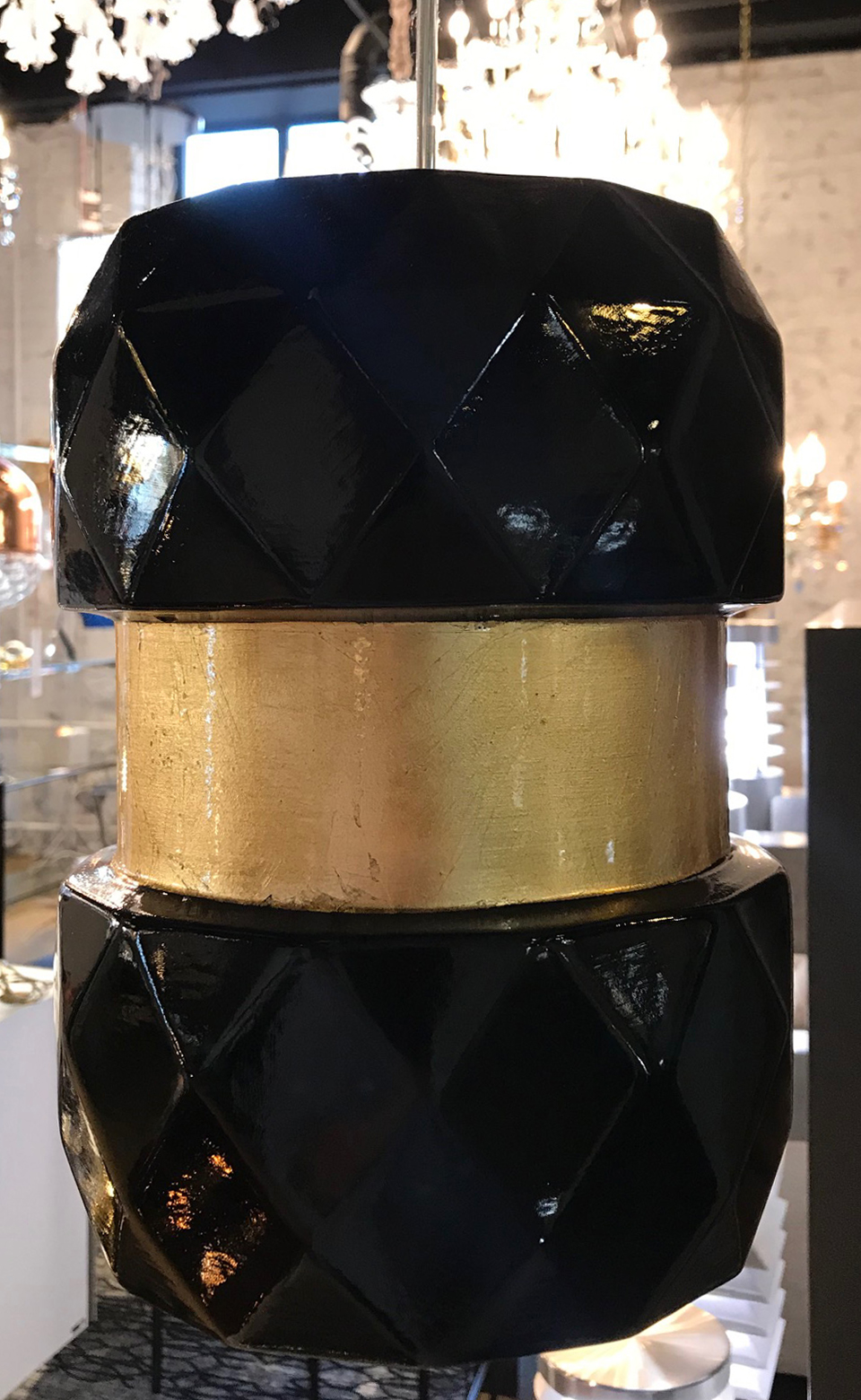 Подвесной светильник JACK на регулируемом тросе. Плафон с оригинальным дизайном выполнен из керамики черного цвета с золотой полосой по середине. Дизайн: Giacomo Baron.
