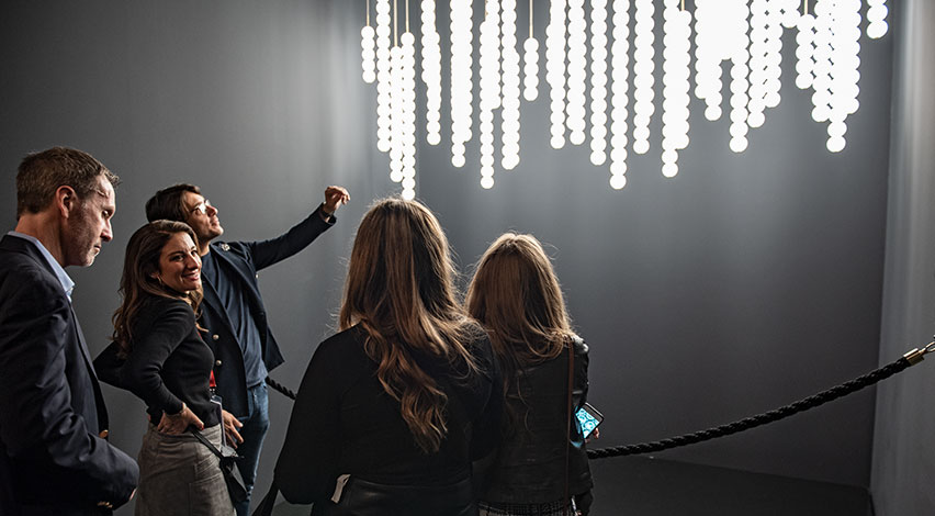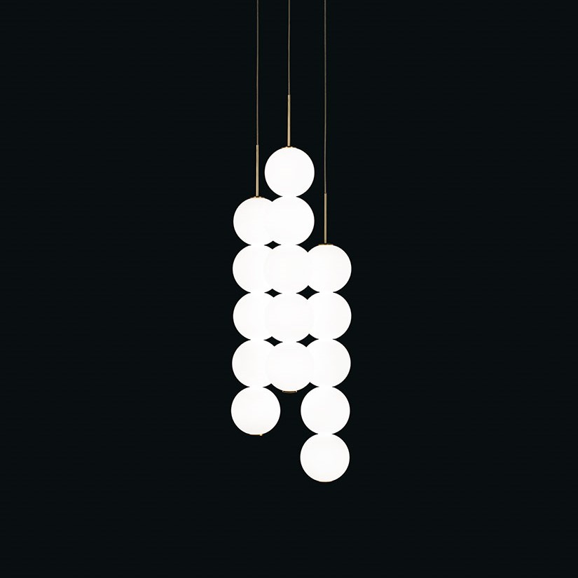 Подвесной светильник Abacus Medium из трех подвесов по 10 стеклянных сфер белого цвета и металлическими стержнями латунного цвета. Потолочная розетка из металла белого цвета. Под заказ светильник доступен с 3 и 16 сферами.
