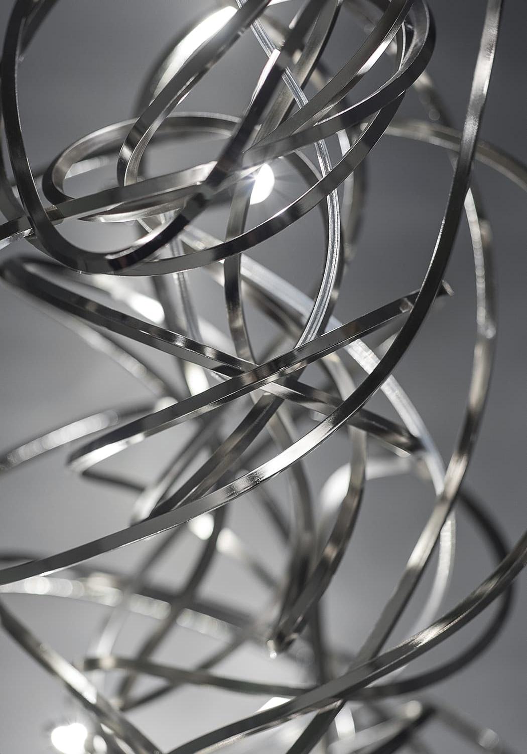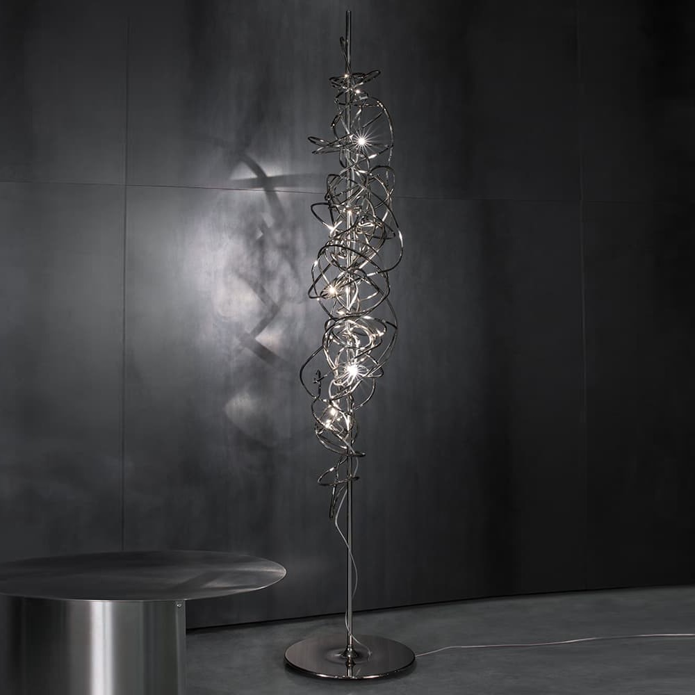 Торшер из коллекции Doodle представляет из себя причудливо переплетенную металлическую проволоку. Отделка металла - никель. Под заказ возможны еще три варианта отделки: черный аметист, золото и медь. Лампочки не входят в комплектацию.